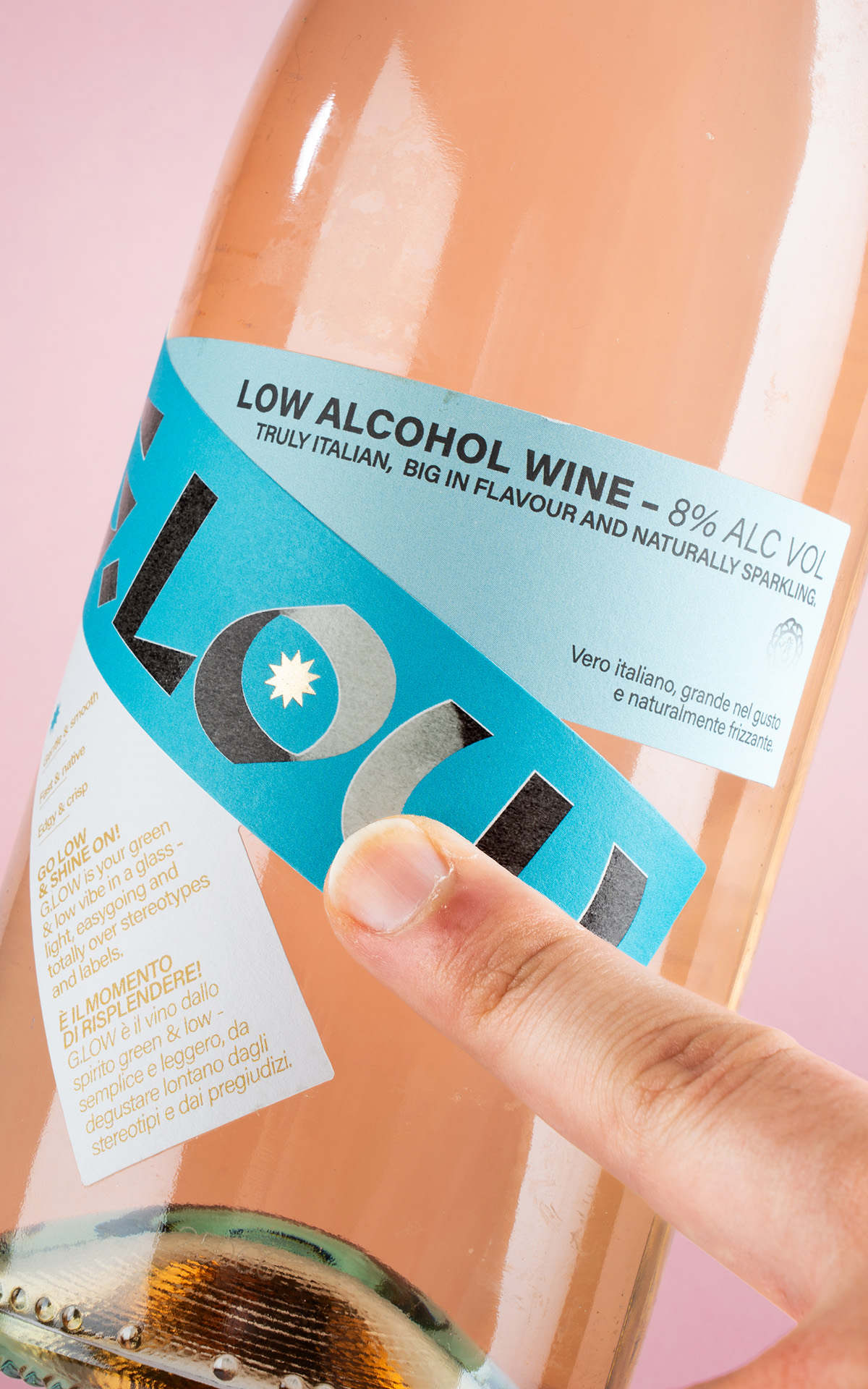 The creative process behind G.Low began with a clear and inspiring brief from the client: “To offer an experience of conviviality and lightness through an innovative low-alcohol wine that redefines the aperitivo ritual with taste, freshness, and a touch of originality. With fully sustainable packaging, we are committed to promoting a responsible lifestyle that celebrates the pleasure of good drinking without compromising environmental respect.” From this vision, we developed a creative path that merged visual provocation with strong, value-driven coherence. After a thorough phase of research and brainstorming, we shaped a concept that breaks with traditional wine label conventions, aiming to speak to a young, conscious, and curious audience. Our main inspiration came from eco-brutalism: a movement that combines the architectural rigor of brutalism—with its geometric forms, concrete structures, and raw aesthetic—with the spontaneous, harmonious return of nature. This contrast between structure and vitality guided us in creating a bold yet balanced and light visual aesthetic, just like the wine it represents. The choice of materials reflects this philosophy: we used Tintoretto Gesso Re-play paper, developed through a pilot project in collaboration with Fedrigoni, which reuses production waste from Cantine di Verona to create an elegant, natural, and fully recycled paper. A tangible symbol of the circular economy. Finally, to add an experiential dimension and make the product even more memorable, we introduced thermochromic ink: transparent at room temperature, it activates as it cools, revealing a black graphic at the wine’s ideal serving temperature. An unexpected detail that engages the consumer and makes the aperitivo ritual even more iconic.