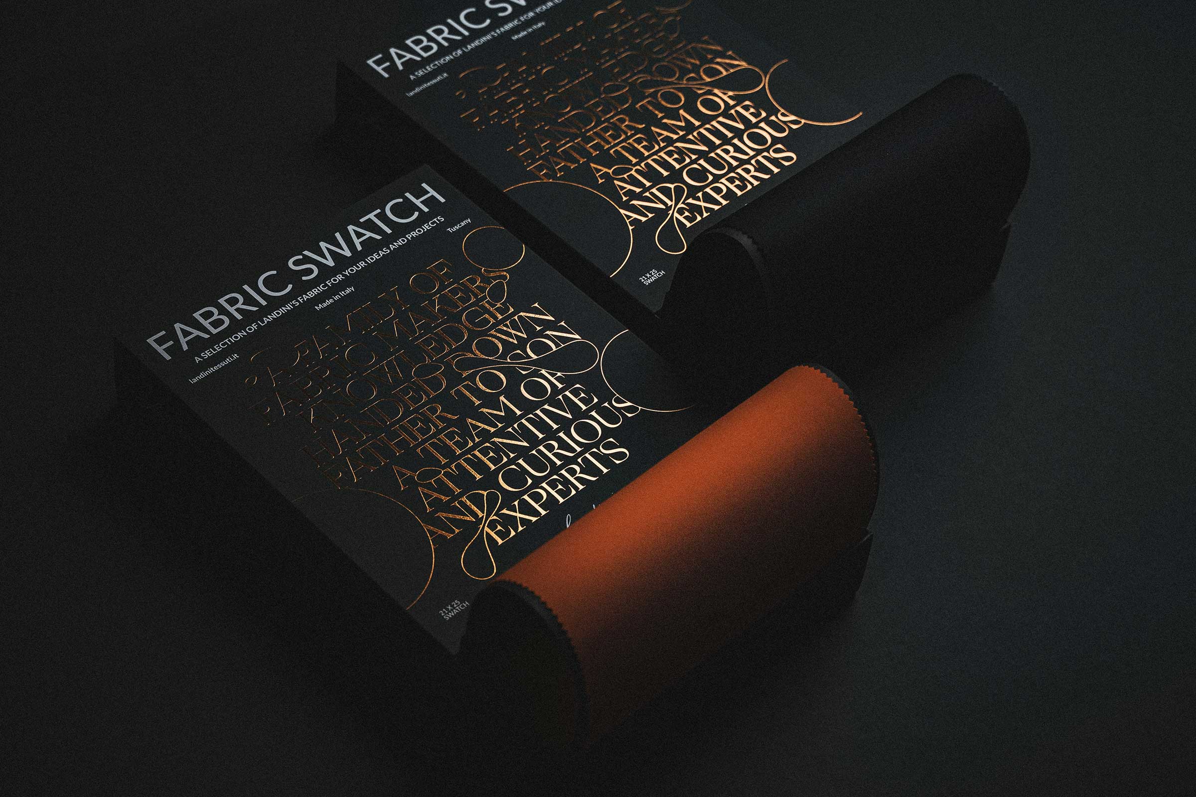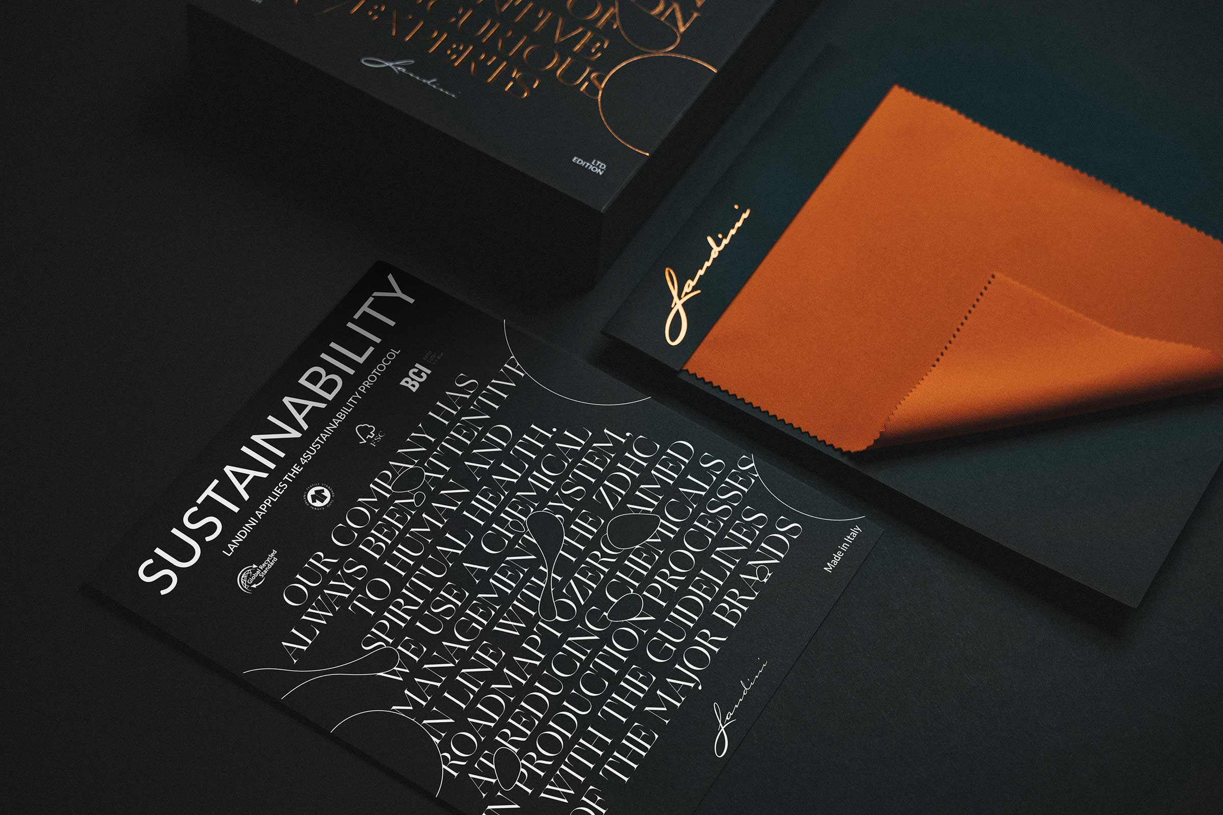 In the wake that Kidstudio has been tracing for a couple of years, the journey continues in search of more sustainable forms of sustainable dialogue between producer and consumer in the field of textiles. For Landini Tessuti, everything revolves around a new, fascinating narrative, entirely conceived in a sustainable way. Landini, fabrics for passion. A company in the Prato textile sector with a strong sensitivity to color, color combinations and the touch of fabrics, it has always created products with the highest aesthetic and functional value. Replacing the salesperson’s paraphernalia, often made up of entire suitcases, with something more agile and streamlined, which can be tailor-made for each customer: this is the goal of the new Limited Edition Swatch Boxes. Elegant and minimally invasive packaging… but certainly unforgettable. Produced entirely in interlocking paper converting, the Swatch Boxes are beautiful, yet sustainable. Due to the use of selected materials such as Fedrigoni’s Sirio Black papers, there is no lack of class and the result – also thanks to a typographic game with great communicative value – is a treasure chest for the best selection of fine Landini fabrics.