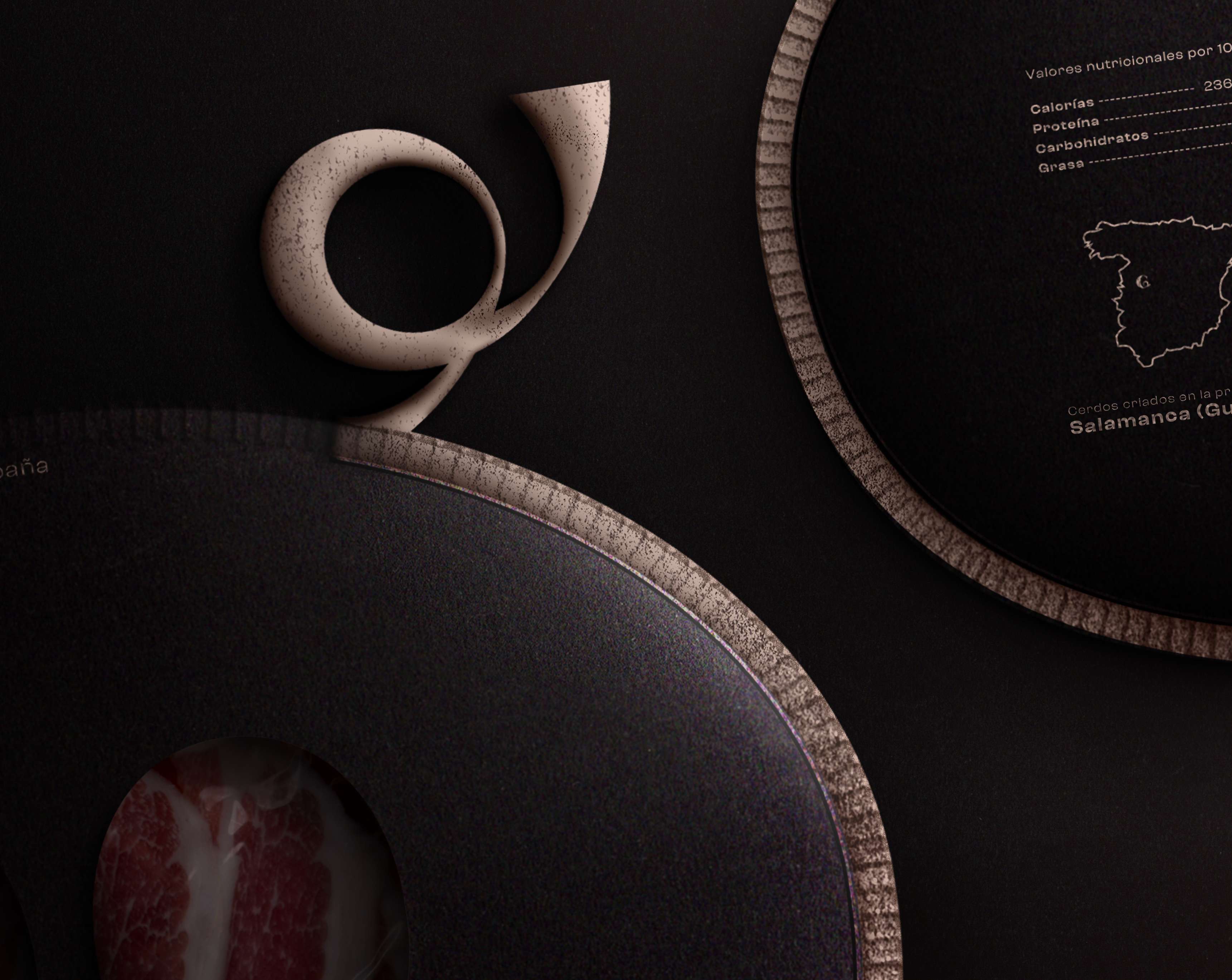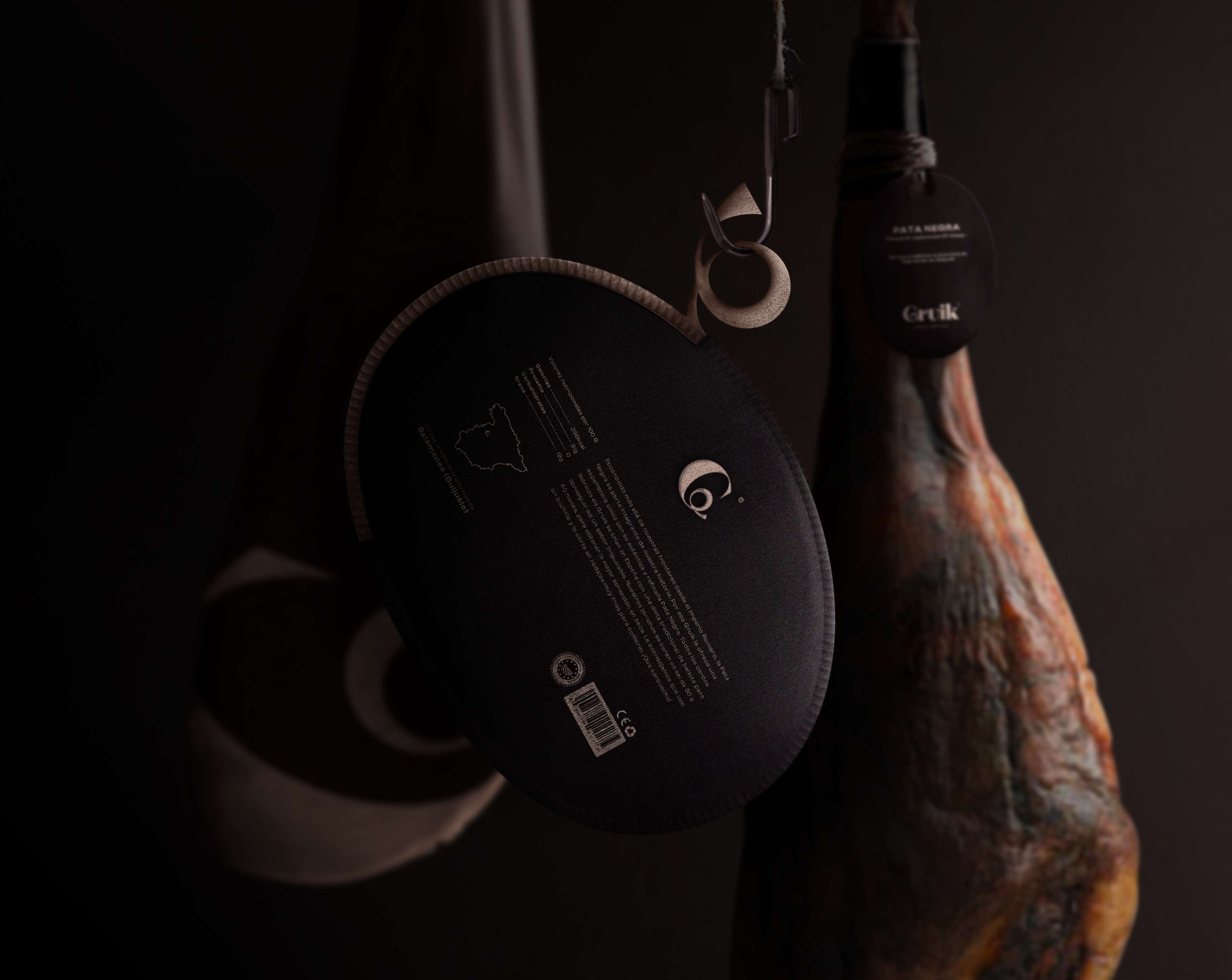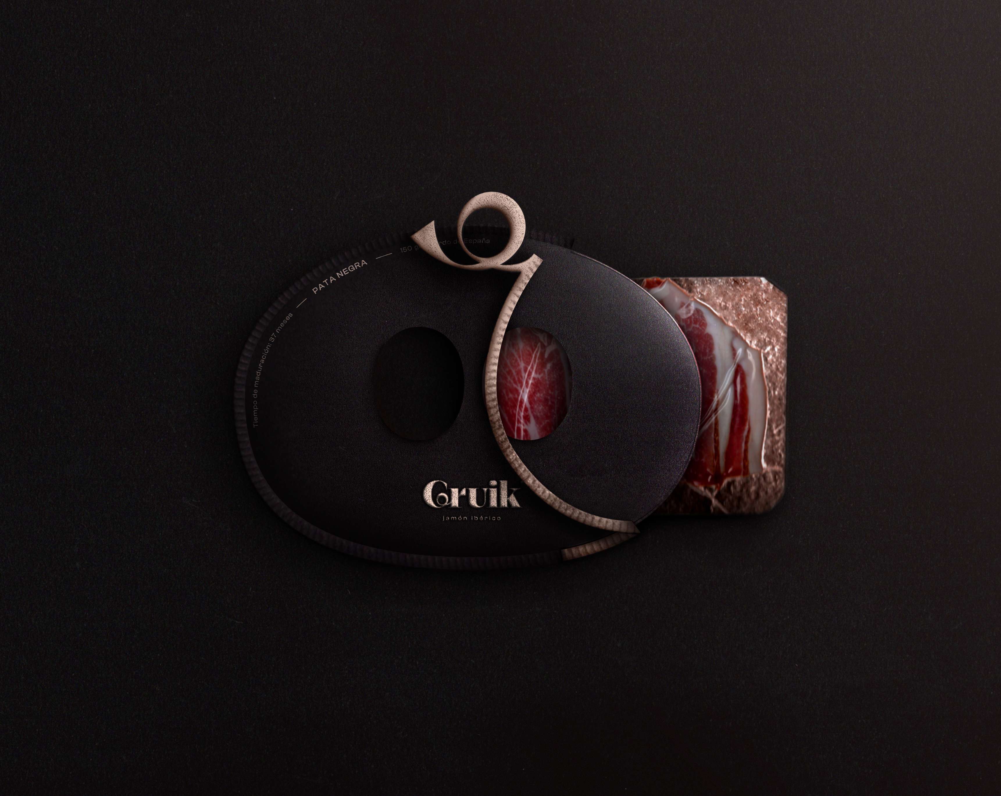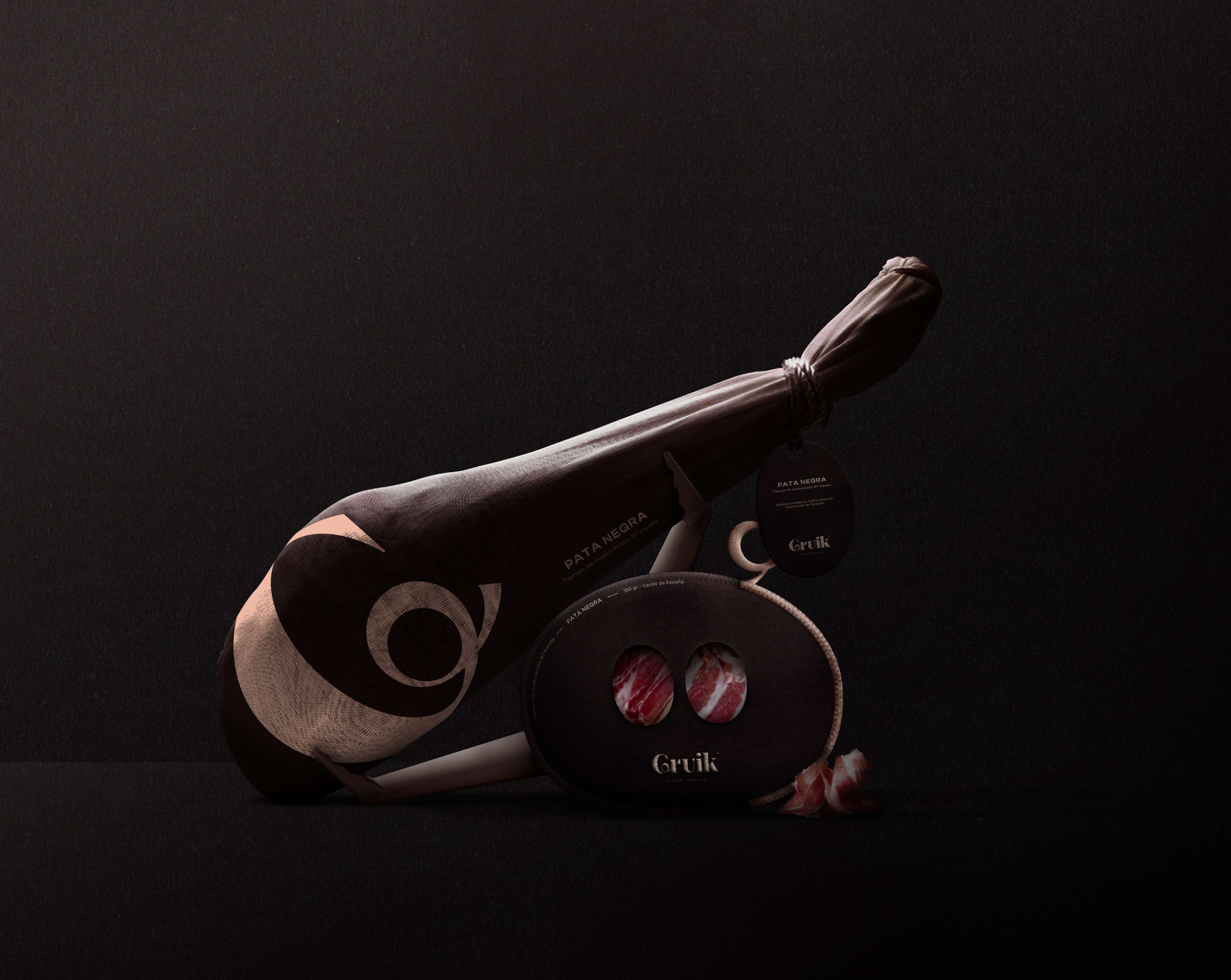 Recognized as THE ham of exceptional quality, Gruik strives to perpetuate the expertise and authenticity of Pata Negra. This gives it an exceptional identity, just like its product. The oval shape and cut elegantly reveal the precious ham. This obviously evokes the snout of Iberian pigs, as does the pull tab to open the packaging in the shape of a pig's tail (featured in the logo). The harmony between the brownish black color reminiscent of Iberian pigs and the slightly brass-colored pink emphasizes this refined aspect.