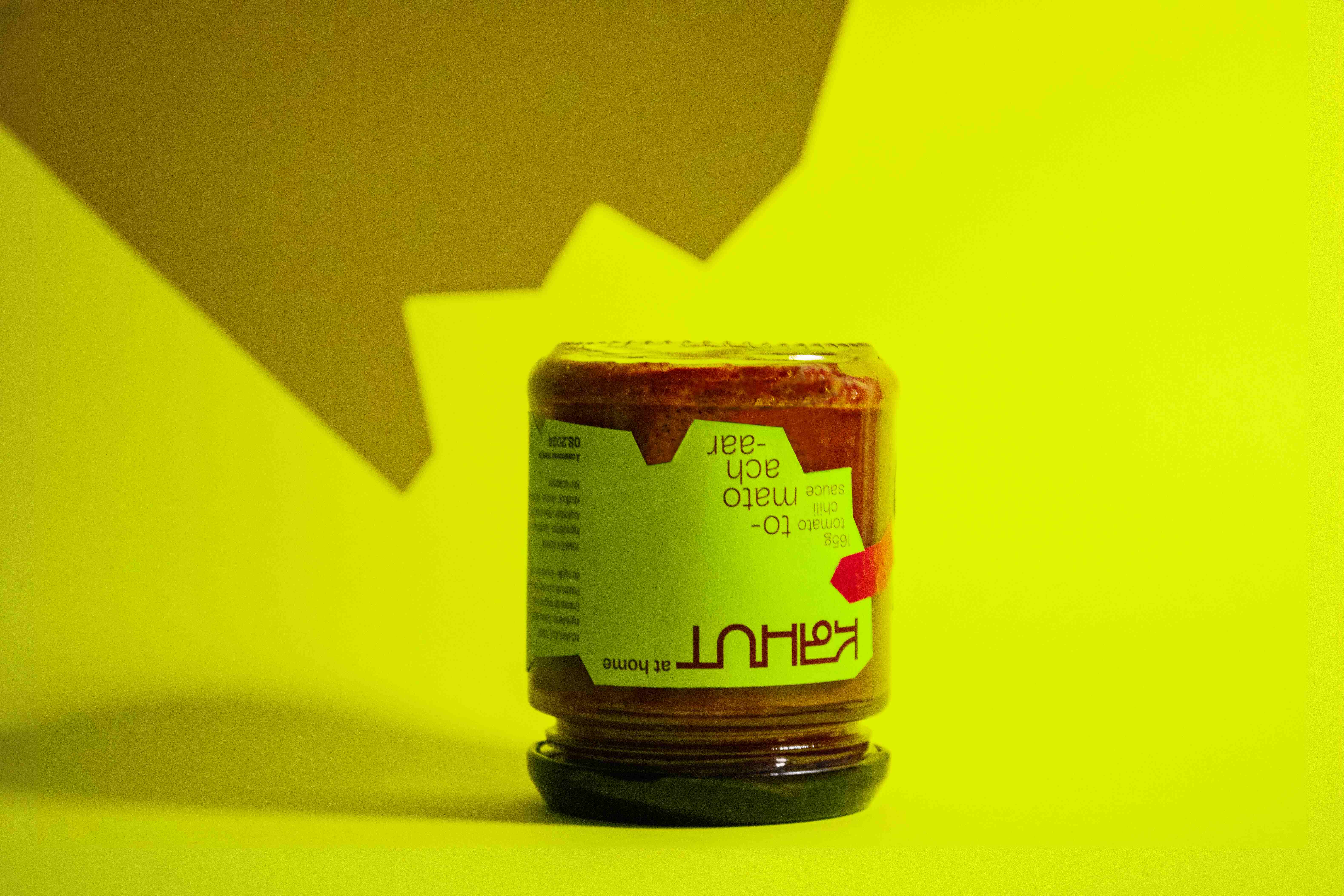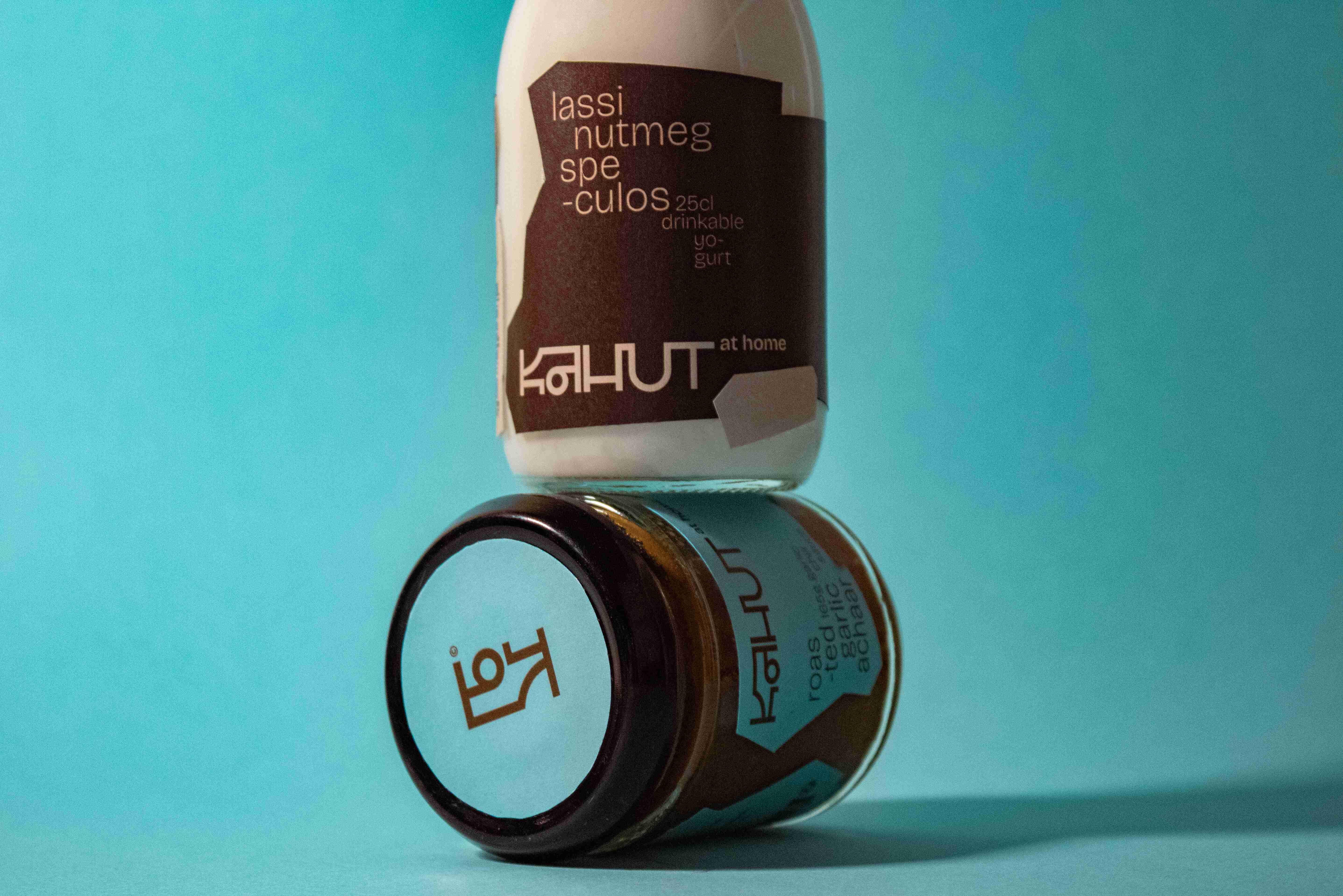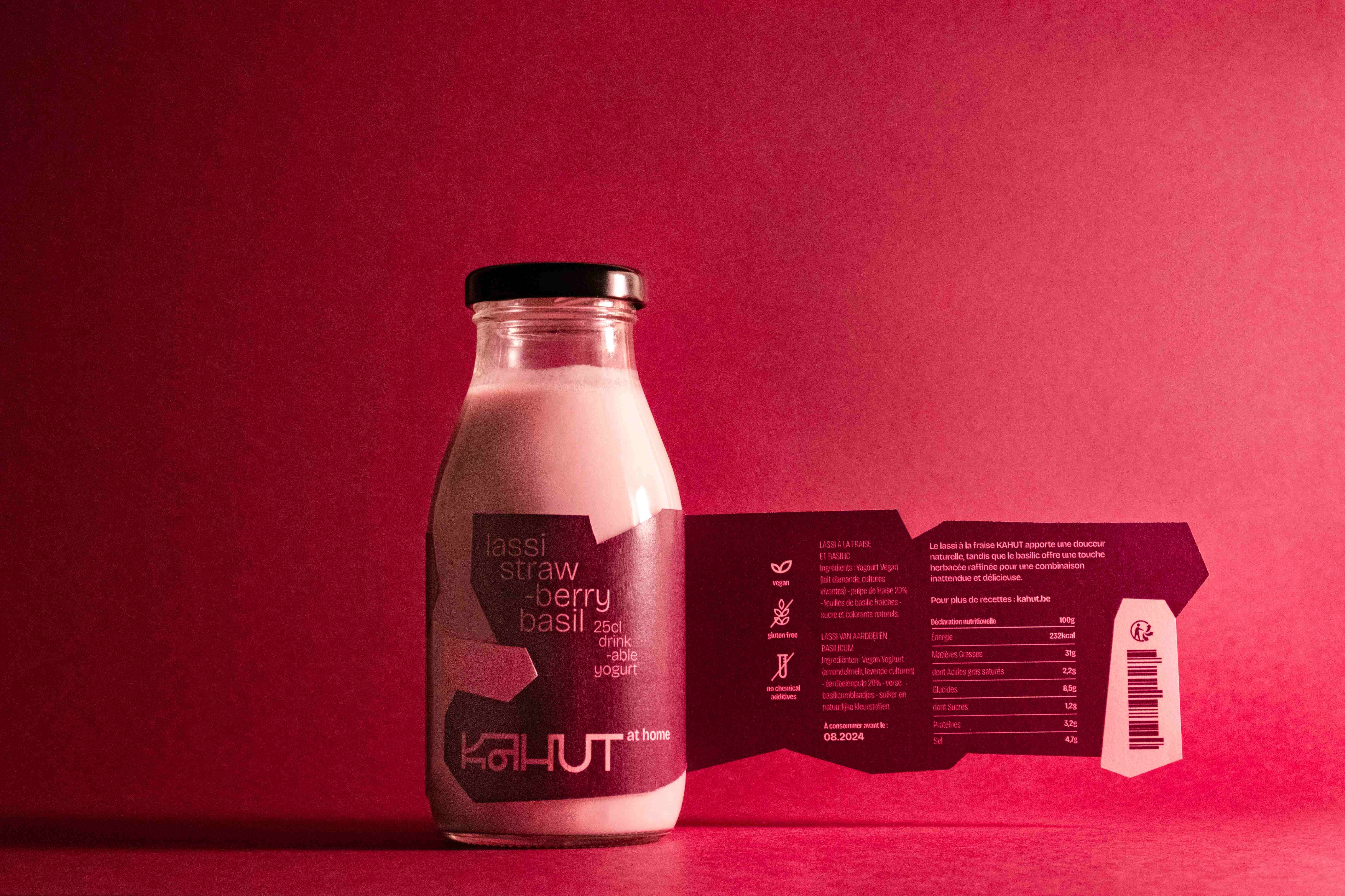 Kahut is a restaurant combining Indian and Ayurvedic traditions with Belgian traditions. The Warlis, an Indian tribe from the state of Maharashtra, are our main source of inspiration. The hut is both their home and a place of exchange and tradition. The hut is the place to go in Belgium to get your chips. Kahut is already a fusion of these two worlds, as the entire logotype. This typeface uses the iconic head bar, characteristic of Devanagari, in its ligatures. Created just for Kahut, it picks up on the Warli style of painting while giving it a more contemporary, western feel. The marriage of cultures is perceptible in the color combinations. The dark tones are taken from Warlis clothing, while the bright colors come from the West. The two-color process reduces the amount of ink used, which is in line with our commitment to the environment. Each label is unique, irregular and imperfect, just like each of us. Inclusion is also a value we hold dear. Our team welcomes everyone and, above all, integrates everyone as they are. We strive every day to make inclusion a normality. The Braille label adds the finishing touch, making our range accessible to everyone.