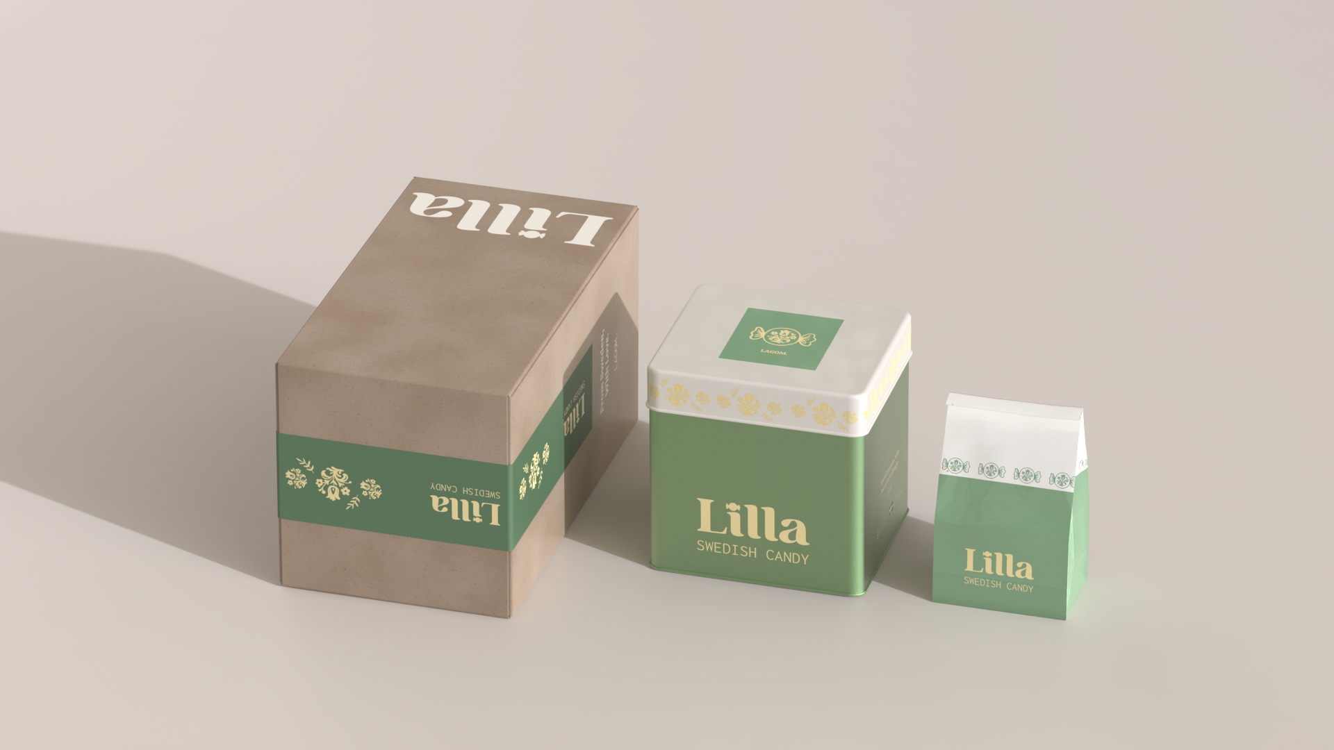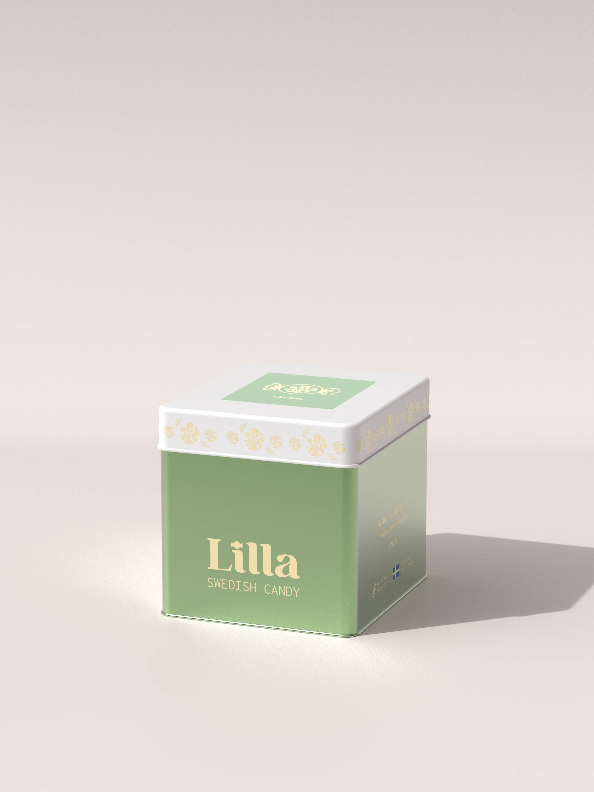 On a pale Swedish-summer morning, Lilla is born from lagom, just enough sweetness to brighten an ordinary day. “From Sweden, with love” isn’t a slogan, it’s the brand’s promise. Lilla brings Swedish candy to the U.S. gummies, sours, chocolates, and marshmallows made with better ingredients, bold flavors, and no GMOs or artificial colors.  Engineering meets charm in the packaging system. A square tin precisely sized to hold two paper bags and a shipping box designed for two tins, or one tin plus two bags, so less air travels, cutting volume, CO₂ per unit, and cost.