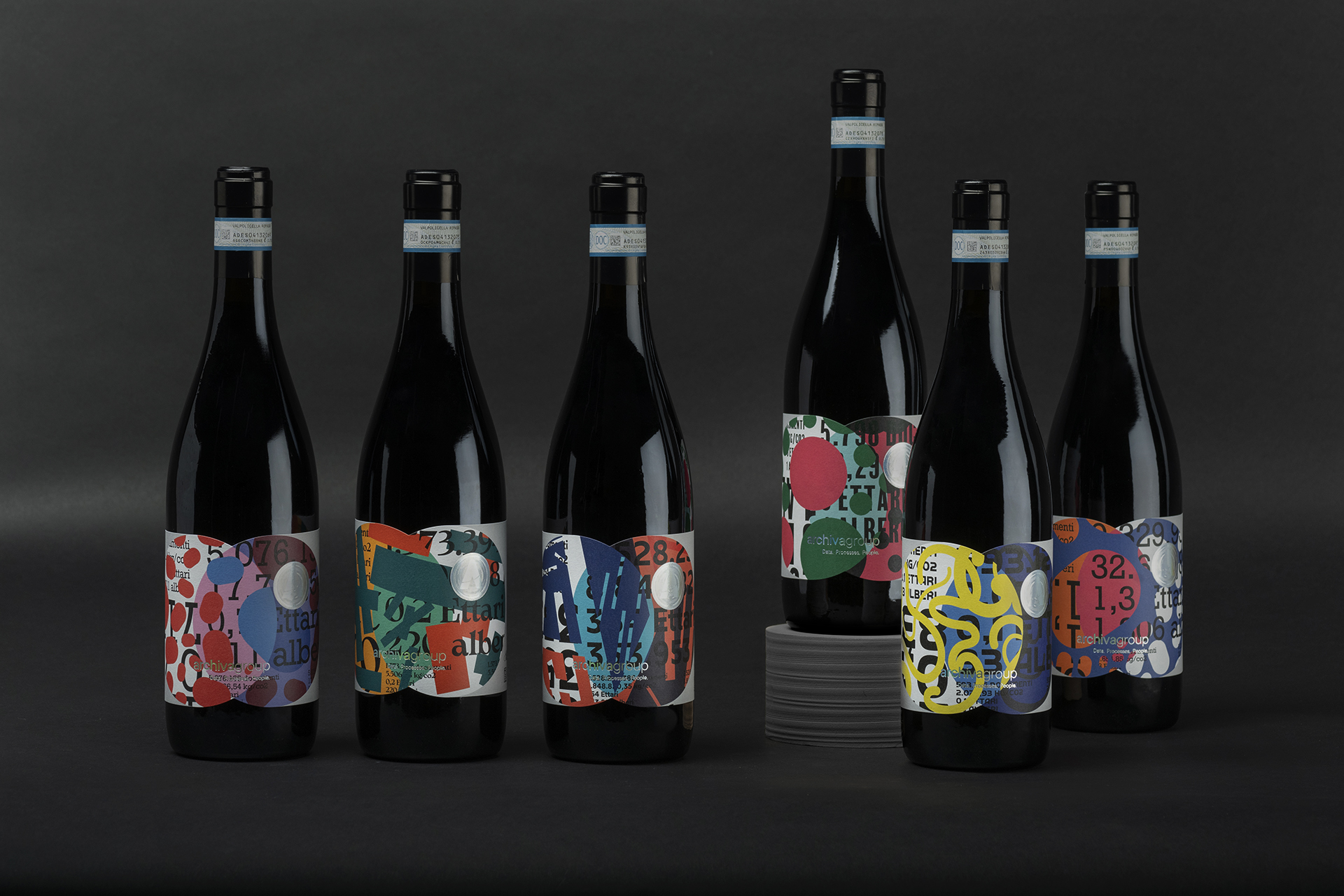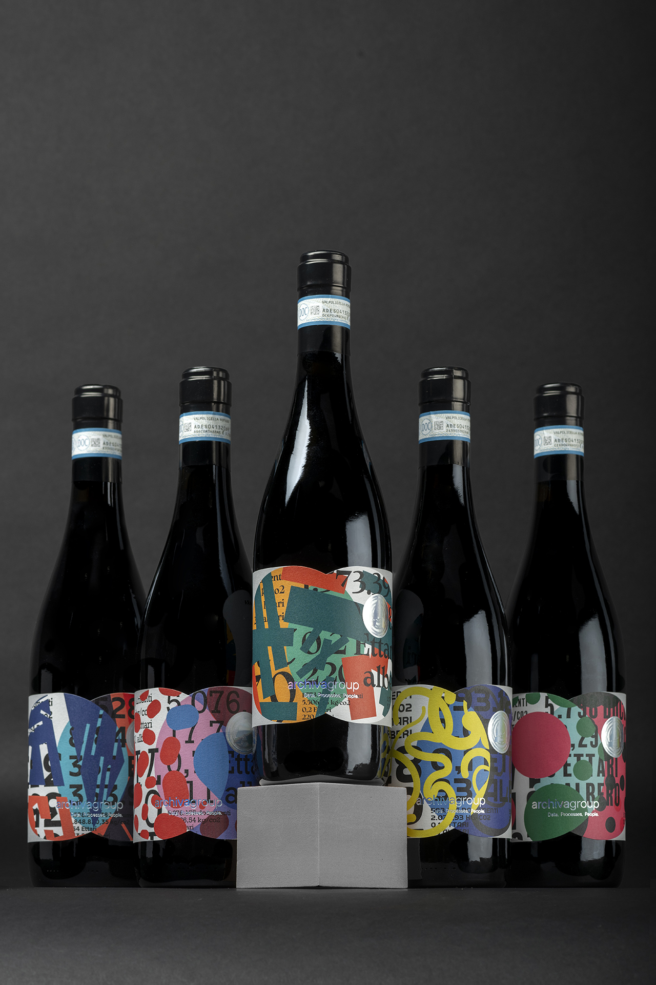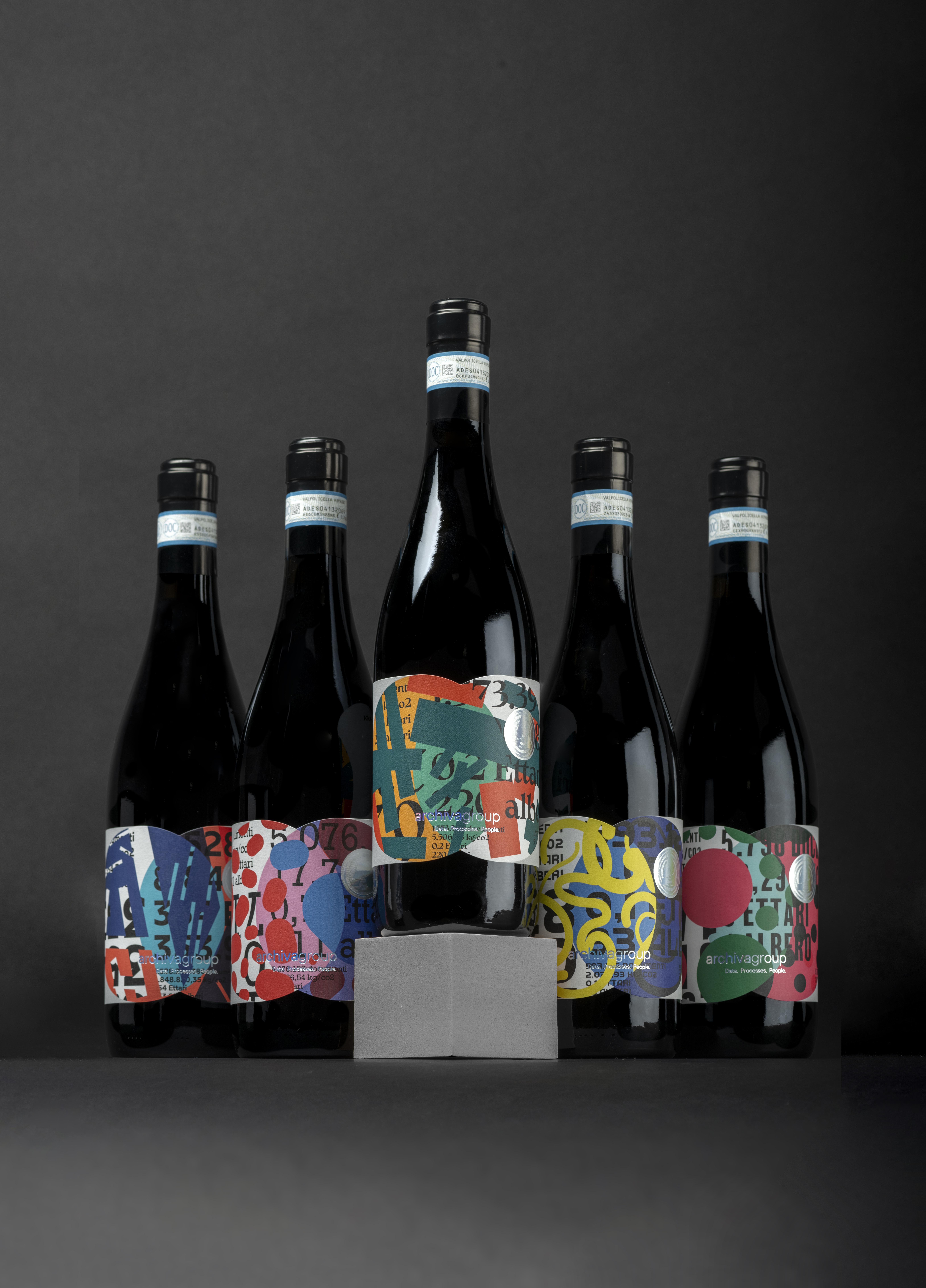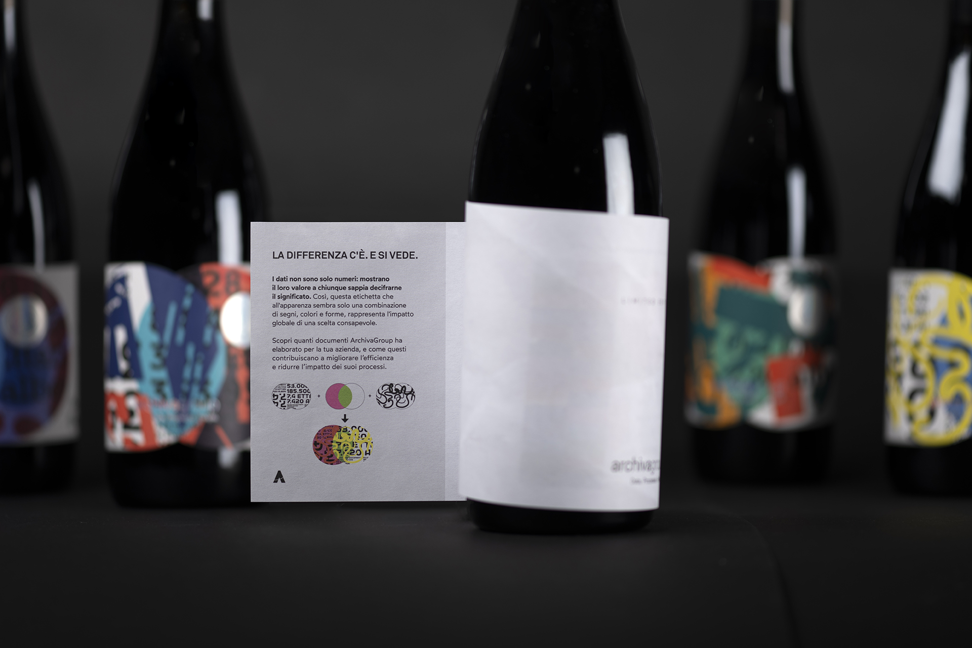 The difference is there and it shows. Data are not just numbers: they reveal their value to those who know how to decipher their meaning. So this label, which on the surface appears to be just a combination of signs, colours and shapes, represents the global impact of a conscious choice. A concept as simple as it is powerful: celebrating the uniqueness of each partner through a shared decision to adopt hyper-automation, dematerialisation and document conservation processes that have a real impact on productivity and the environment. Every document that is processed and digitised is equivalent to a sheet of paper that will be used for a purpose with a higher added value. Multiplying the optimisation by millions of documents means taking concrete and measurable action, preventing the release of hundreds of tonnes of CO2 into the atmosphere and saving thousands of trees every year. This is how Archiva came up with the idea for this corporate gift to the CEOs, CFOs and IT staff of the most important Italian companies: a bottle of the best Valpolicella wine from Cantine Allegrini, with a unique label, a masterpiece of variable data printing created with HP Indigo technology. The textures and vibrant colours, combined in an unprecedented way, tell the story of the collaboration with the Archiva Group. A real, tangible commitment, far from the greenwashing facade that serves no one.