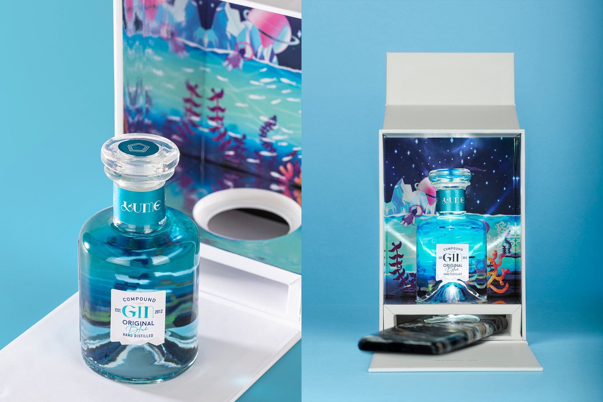 It’s not just a gin or a label. Lume – Spirit of the Abyss is an experience, an invitation to explore and start seeing things from another point of view. And to find out how the world changes when we look at it with curious eyes. When we look out over the ocean towards the horizon, the water darkens from turquoise to navy – almost black. We feel a thrill. We wonder what’s hidden in that unsoundable abyss and are a little scared of what might rise up from it. Our courage fails before such majesty and – in the equally impenetrable depths of our souls – something lights up inside us. It’s the spark of curiosity, stronger than any fear, the power that drove us to discover new lands and even touch the moon, and what still drives us to keep asking what’s hidden beneath what we see. In the darkness, even the faintest glint becomes a floodlight illuminating the unknown. That’s when we discover that we’re not alone, and that darkness is nothing but a border we can push away with the help of the flame we nurture inside. Welcome to Lume. Welcome to our world. Technical description Lume – Spirit of the Abyss is so much more than a mere label – the packaging forms part of the experience. Using a personal device such as a smartphone is the bridge leading to and illuminating the unknown. Once the bridge has been crossed, the bottle comes to life and reveals its secret world.
