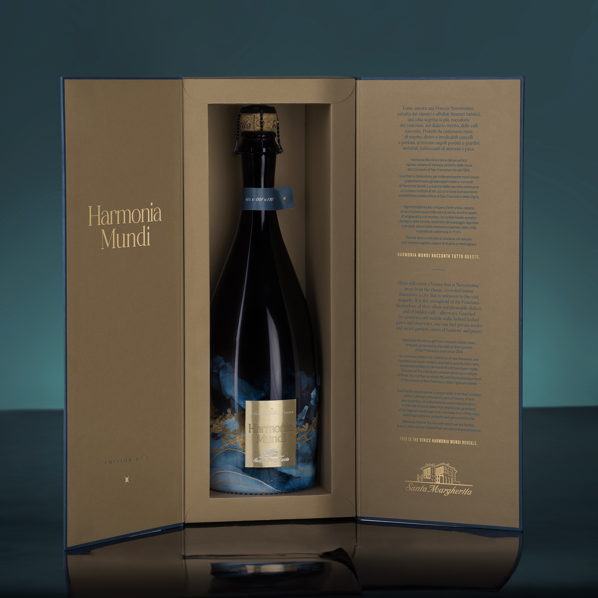 Harmonia Mundi is born from water itself – its bottle rising gracefully to reveal a distinctive shape and texture. Crafted using an exclusive and cutting-edge decoration technique: sublimation, also known as water dipping. Harmonia Mundi is a gift from Venice’s oldest urban vineyard, protected by the walls of the Convent of San Francesco ever since 1254. Its vine rows stretch for a distance of one 1.107 meters, and that is exactly how many numbered bottles of Harmonia Mundi have been made, numbered by hand. The sum of the individual numerals gives us a multiple of three, the number on which the architectural proportions of the church of San Francesco della Vigna are based. Each bottle stands alone: a unique work of art that contains within it almost a thousand years of history, of arts and expertise, of craftsmanship and professionalism. A thin slat of wood taken from the brìcole, typical wooden poles of the lagoon’s landscape and a veritable icon of the city’s seafaring traditions, protects and adorns the bottle. Because, behind the one with which we are familiar, there is still a secret Venice that can astound and amaze us. THIS IS THE VENICE HARMONIA MUNDI REVEALS.