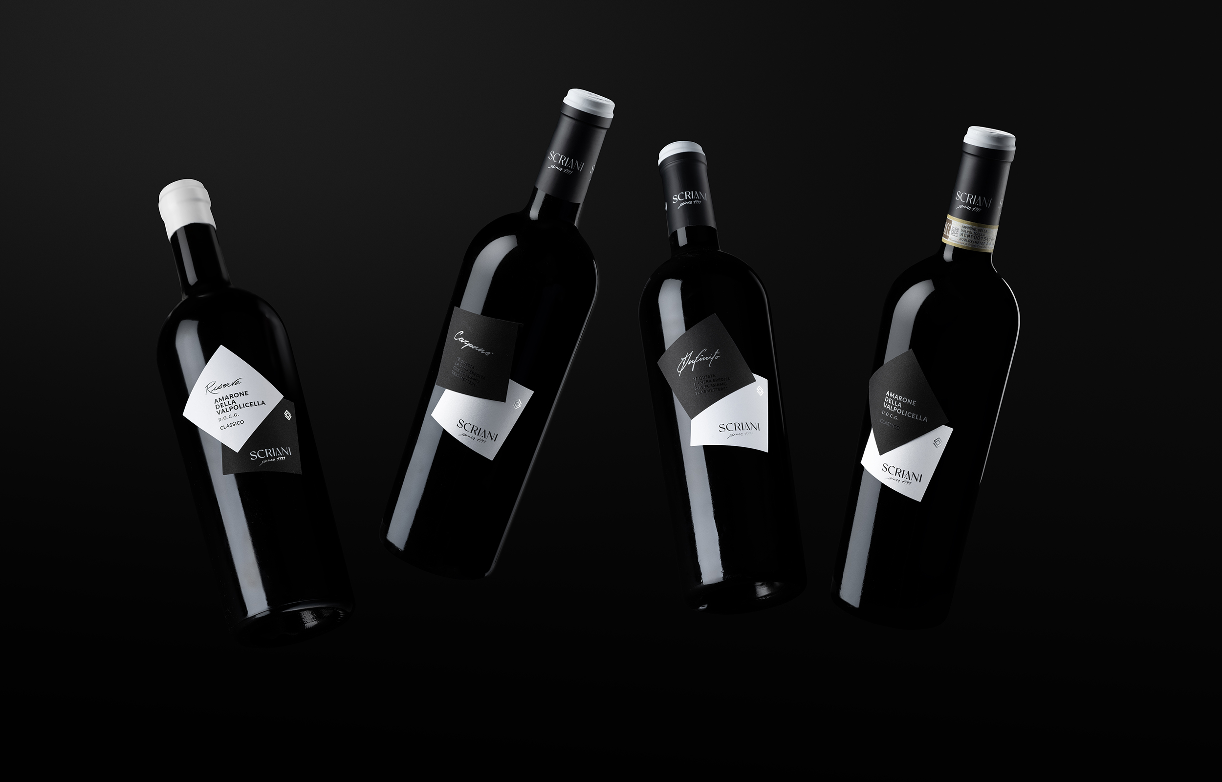 The complete renewal of the Scriani Winery's visual identity revolves around the concept of evolution. The current generational change within the family becomes a visual reference to represent the growth of the company through the synergic work of two generations to create increasingly better products. The shapes of the diamond and the square merge in perfect harmony, overlapping and evolving to create new geometries. It is from these shapes that the labels identifying the different wines are born, together with an elegant logo recalling the same shapes. The pictogram was born from the union of the Scriani 'S' and a reinterpretation of the decorative element. The result is a figure with a minimalist and sincere design, in keeping with the company's history.