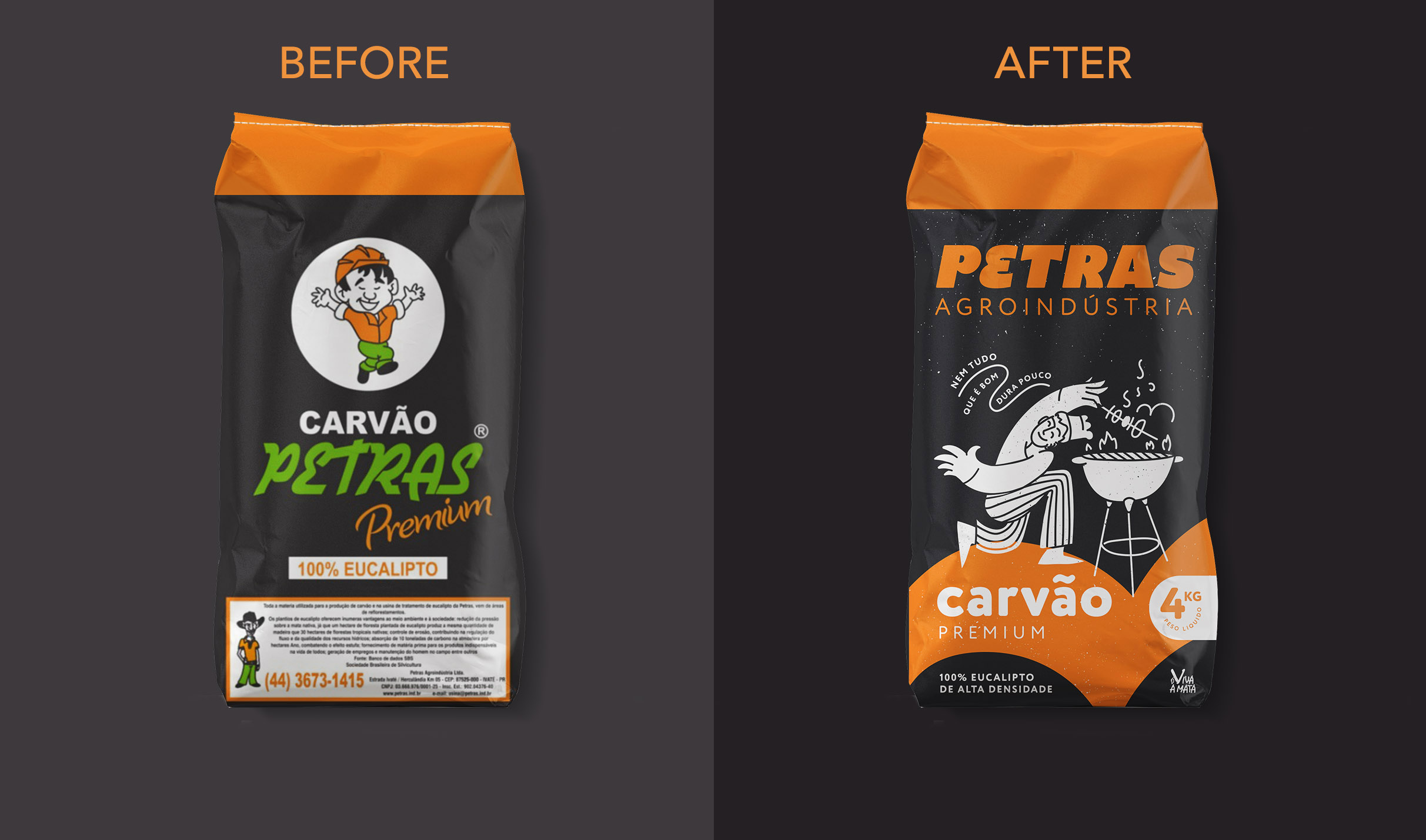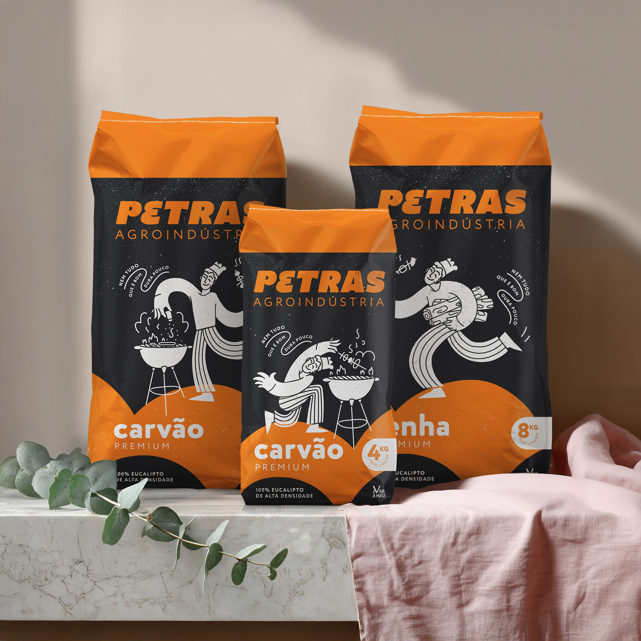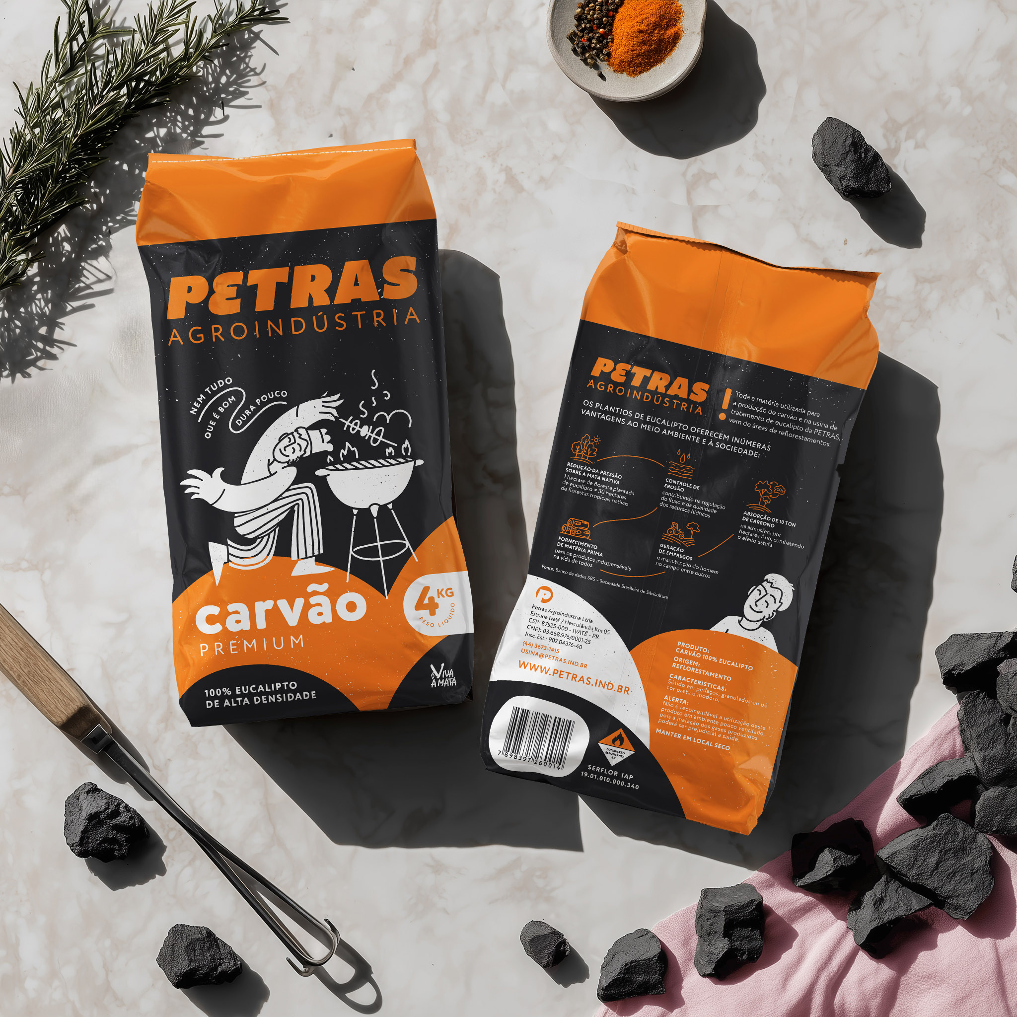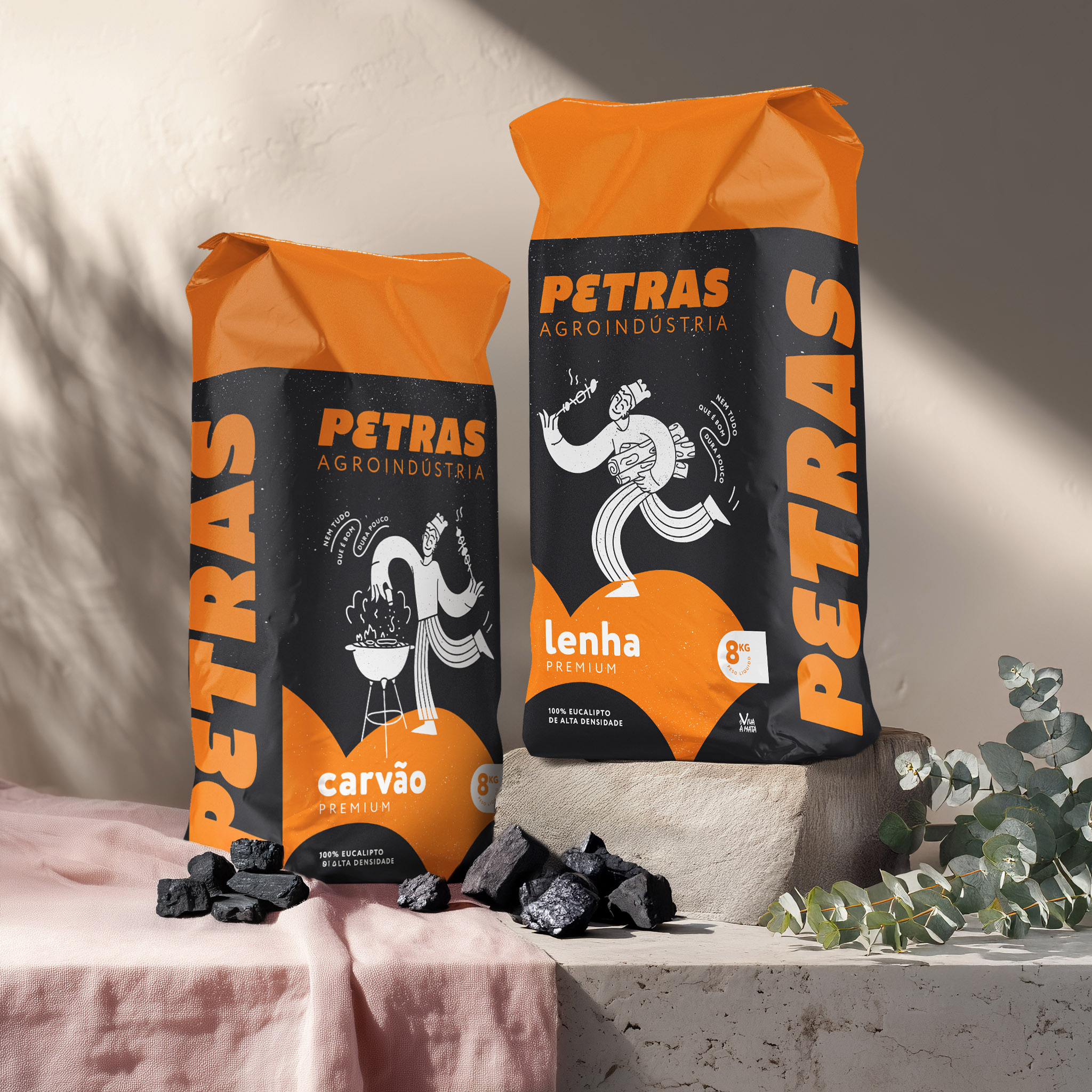 Petras is a family-run business from rural Brazil producing sustainable eucalyptus charcoal and other eucalyptus-based products. After 25 years, they came to us ready for a new chapter—while honoring the story that brought them here. The refresh begins with a refined logo, preserving Petras’ distinctive “E” and recognizable green and orange palette, now balanced and clarified for modern use. For the consumer line, we reimagined their mascot—originally from local comics—into a clean, contemporary illustration that brings warmth and approachability to every pack. On the corporate side, the logo stands confidently on its own, ready for business cards, delivery trucks, and B2B presentations where formality calls for a simpler look. For the charcoal range, we retained Petras’ signature black packaging and vivid orange stripes, ensuring a smooth transition on store shelves while keeping the brand instantly recognizable to returning customers. The mascot playfully spans three pack sizes, each capturing the joy of grilling while maintaining a clean, practical structure that holds up after opening. This is packaging that feels considered and confident—honoring Petras’ past while preparing them for what’s next.