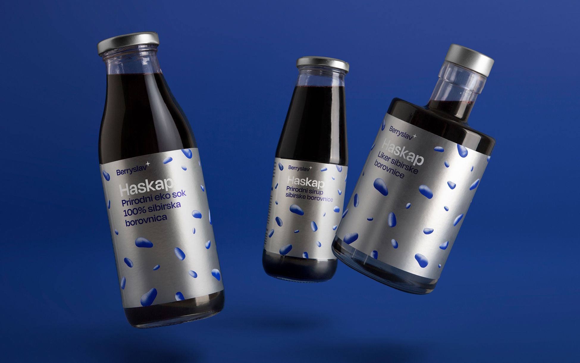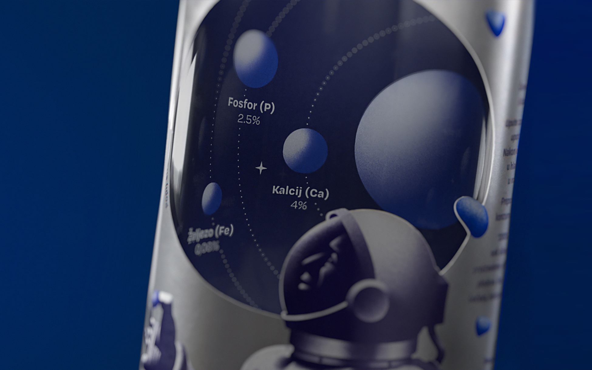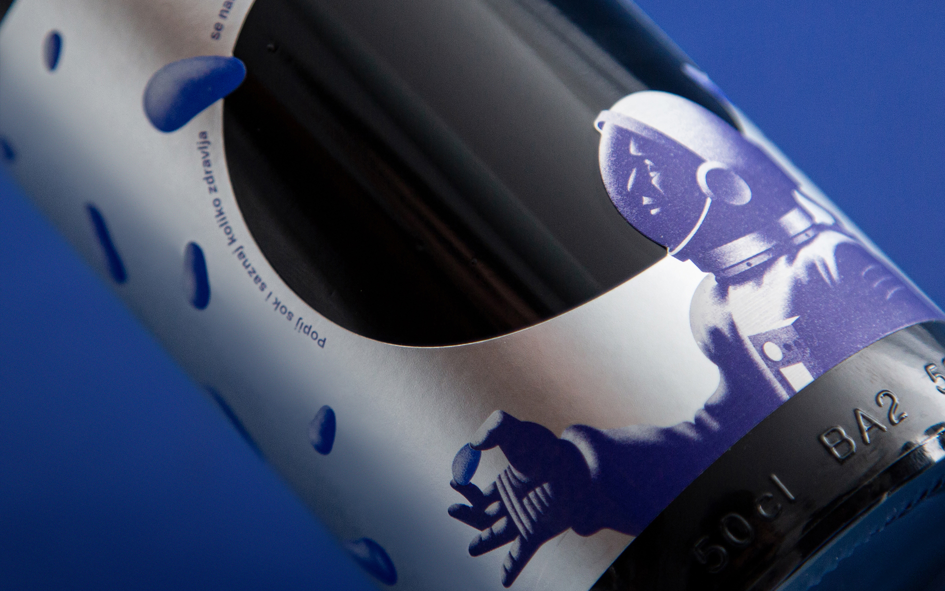 Haskap or honeyberry is a fruit incredibly rich in antioxidants, minerals, and vitamins. It contains up to 10 times more Vitamin C than blueberries, and its total antioxidant capacity is 30% higher than that of Aronia. Originally from Siberia, this superfood can withstand temperatures as low as -47 °C in the winter. Due to its special properties, Soviet astronauts carried haskap juice into space where it was soon pronounced a royal beverage. It was this fact that inspired us to showcase the astounding quality of the product through its use in an exquisite environment such as space. A pattern of stylized honeyberries decorates the entire area of the metallic label, which is visually reminiscent of space food packaging. Only when the bottle is turned around do we see the entirety of the idea - the pattern actually represents the fruit floating in a zero-gravity space capsule, along with an astronaut looking out into the darkness of space through a window on the label. Once the bottle is emptied, the inside of the label reveals planets of various sizes that visualize the percentage of minerals present in 100 grams of haskap. Through a combination of all these elements, the bottle is transformed into a three-dimensional representation of the product.