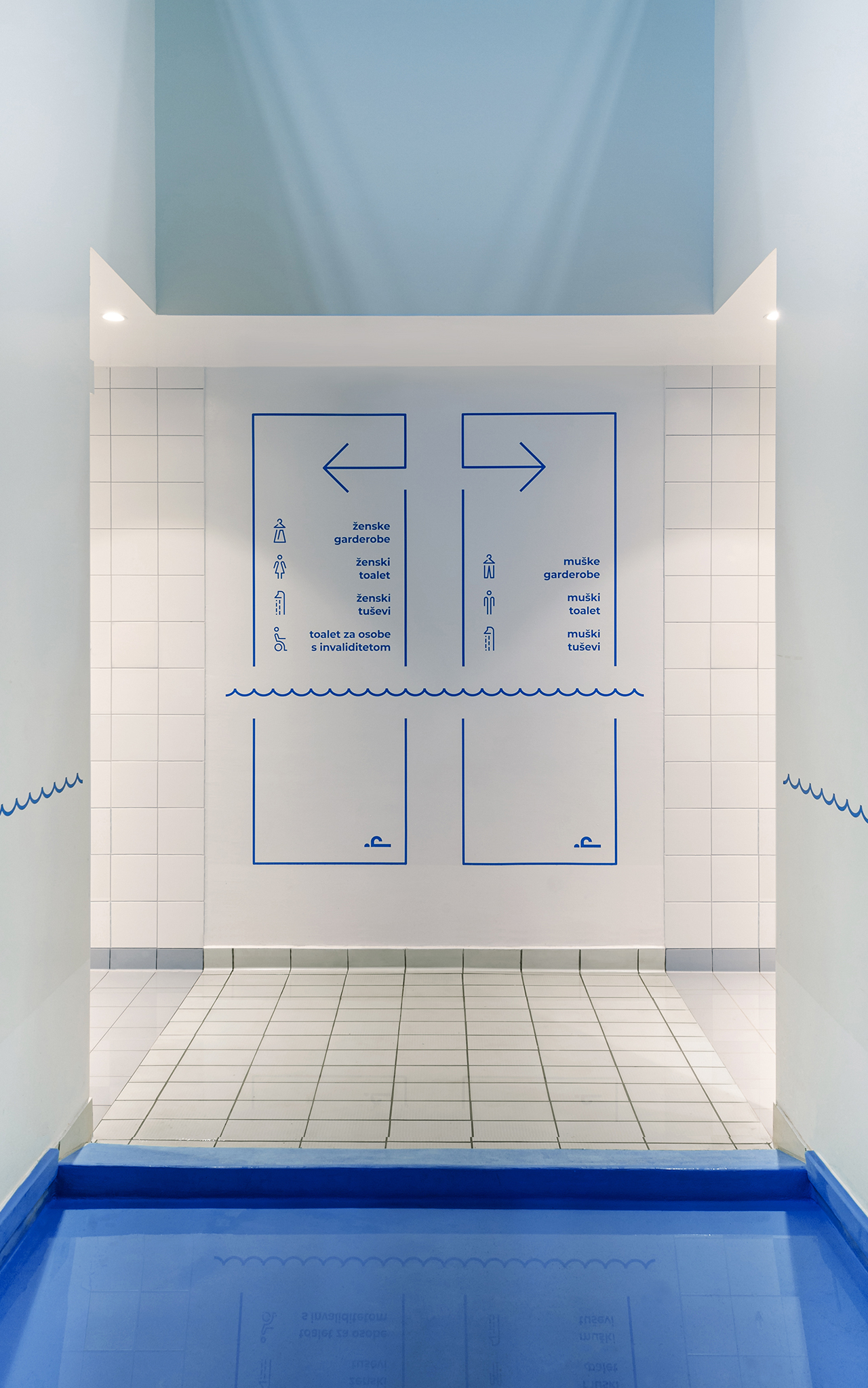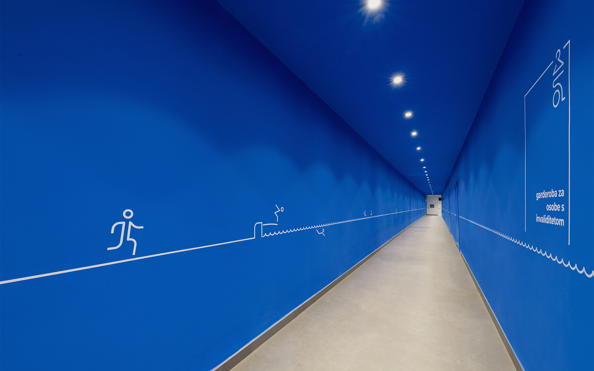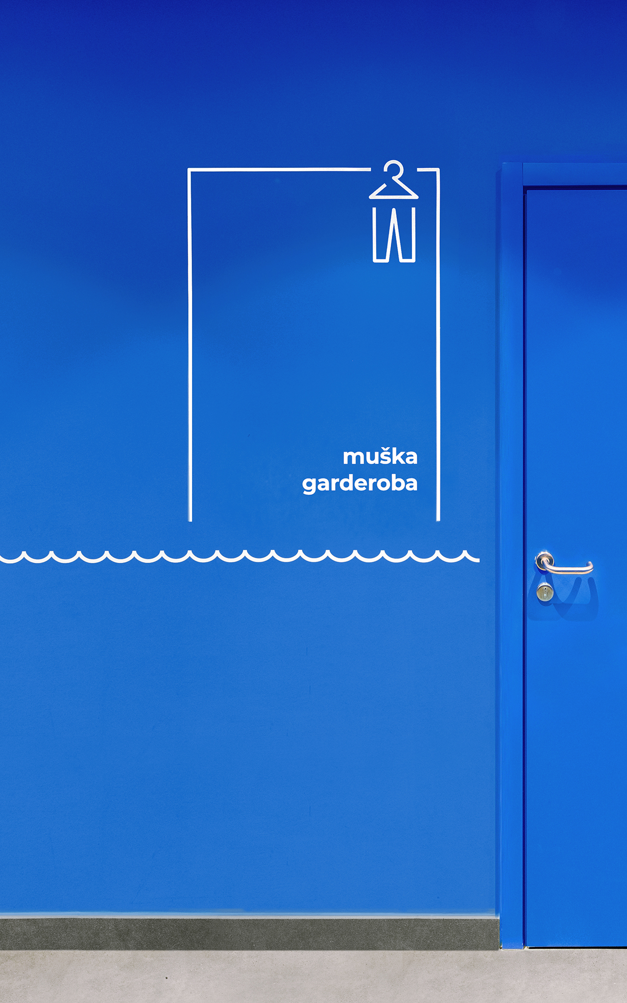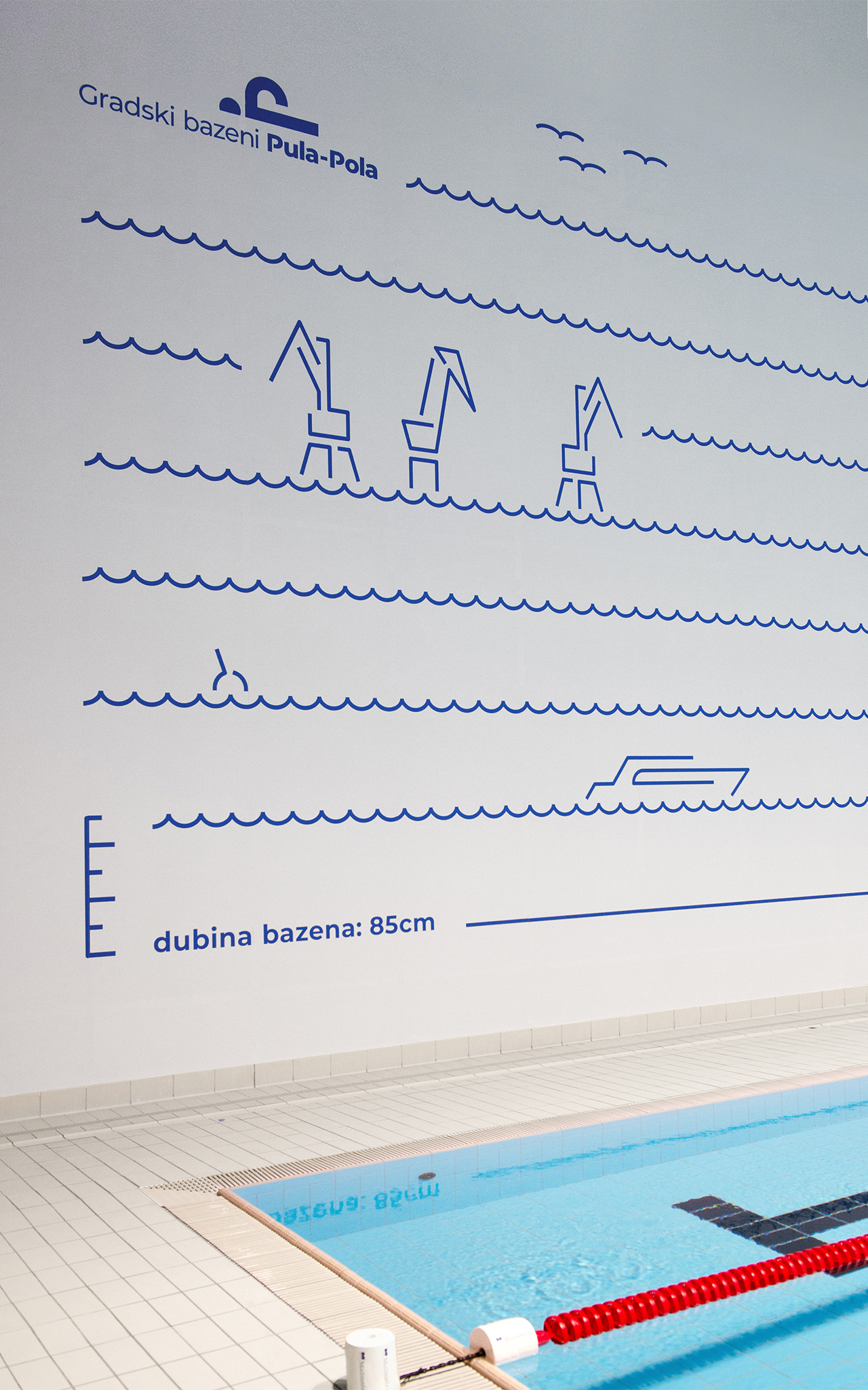 Pula City pools are much anticipated public swimming pools opened in 2018 for swimming and water-polo clubs, as well as the citizens of Pula. The complex of 5900 square meters consists of a swimming pool for water-polo and swimming, multifunctional and children’s pool, fitness halls, a café, and a sports shop is soon to be opened. Our task was to conceptualize and design the visual identity of the pool, as well as the inside and outside signalization of the complex. The identity concept is based on our conversations with professional and recreational swimmers who have given us the idea about a line. It has become our guiding principle, just like the line on the bottom of the pool guides the swimmer towards the finish line. Upon entering the building, the visitor is going to be guided by signalization to the main hall that connects the lobby with the other pool facilities. Along the hall there is a stylized line in the shape of water that serves as a basis for showing different illustrations from the pool. These are “animated” versions of the icons that are normally being used when marking building facilities. Besides that, the information about the water depth has been integrated in a big illustration of the most prominent sites of Pula. While the visitors are passing through the building, they witness the “evolution” of the sign purpose – from the strictly functional one, to the one that makes the whole space alive.