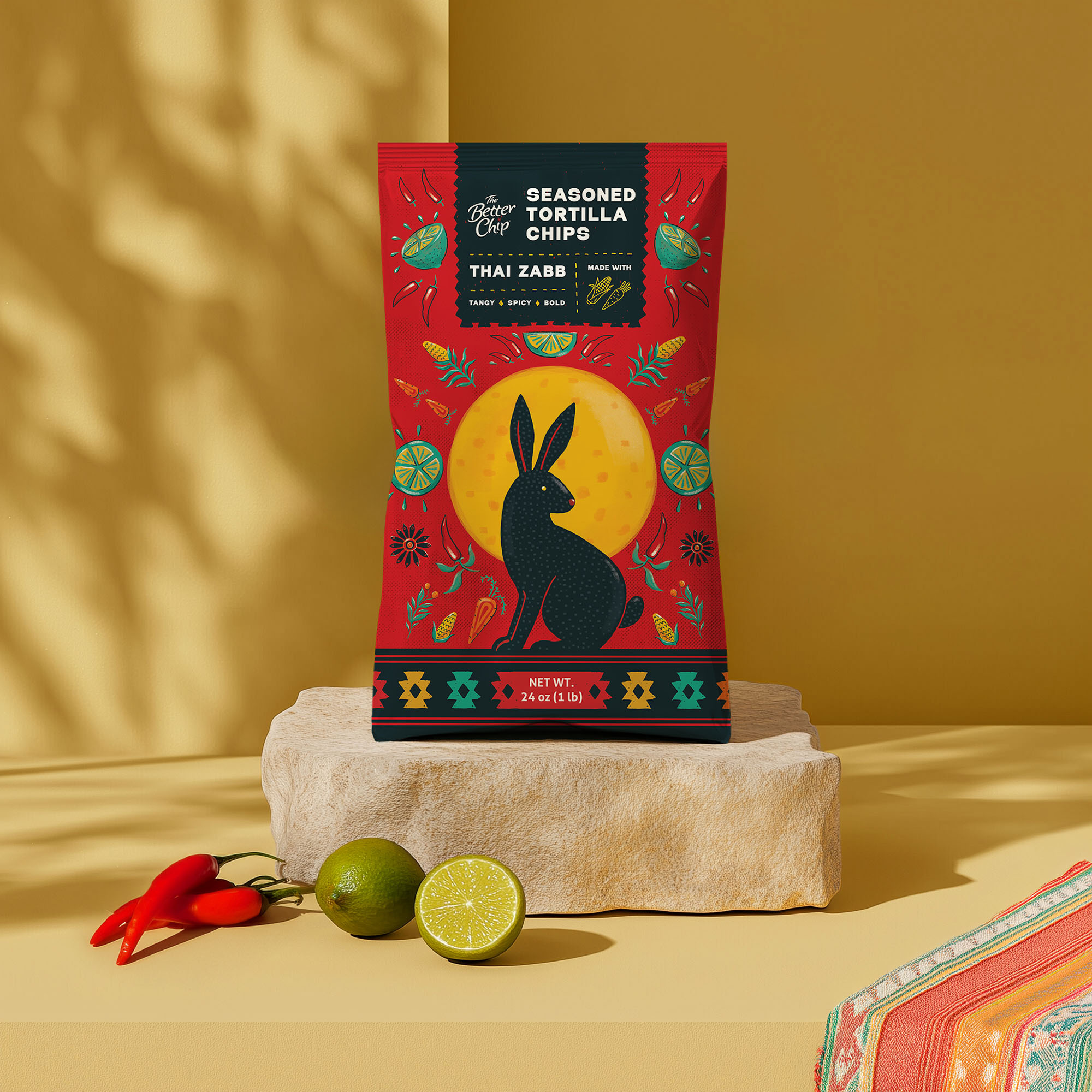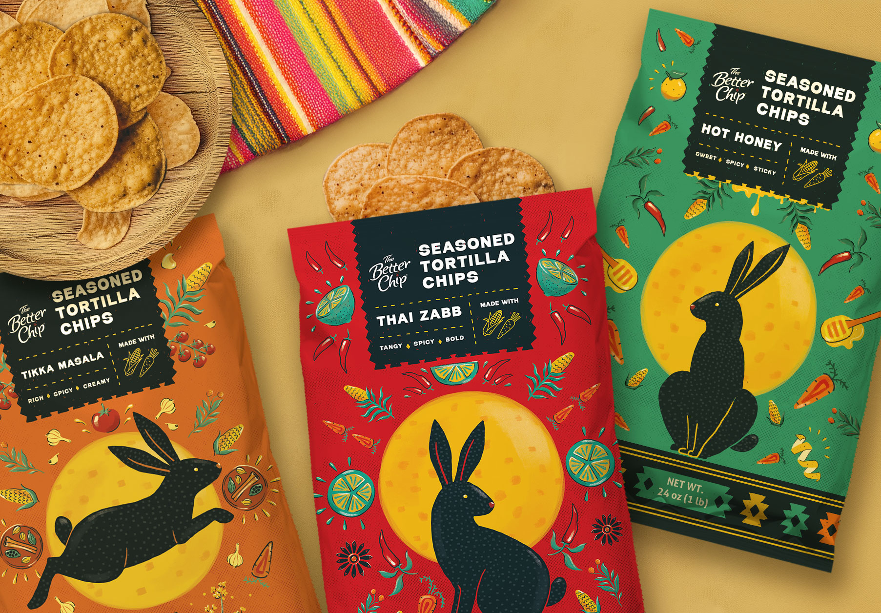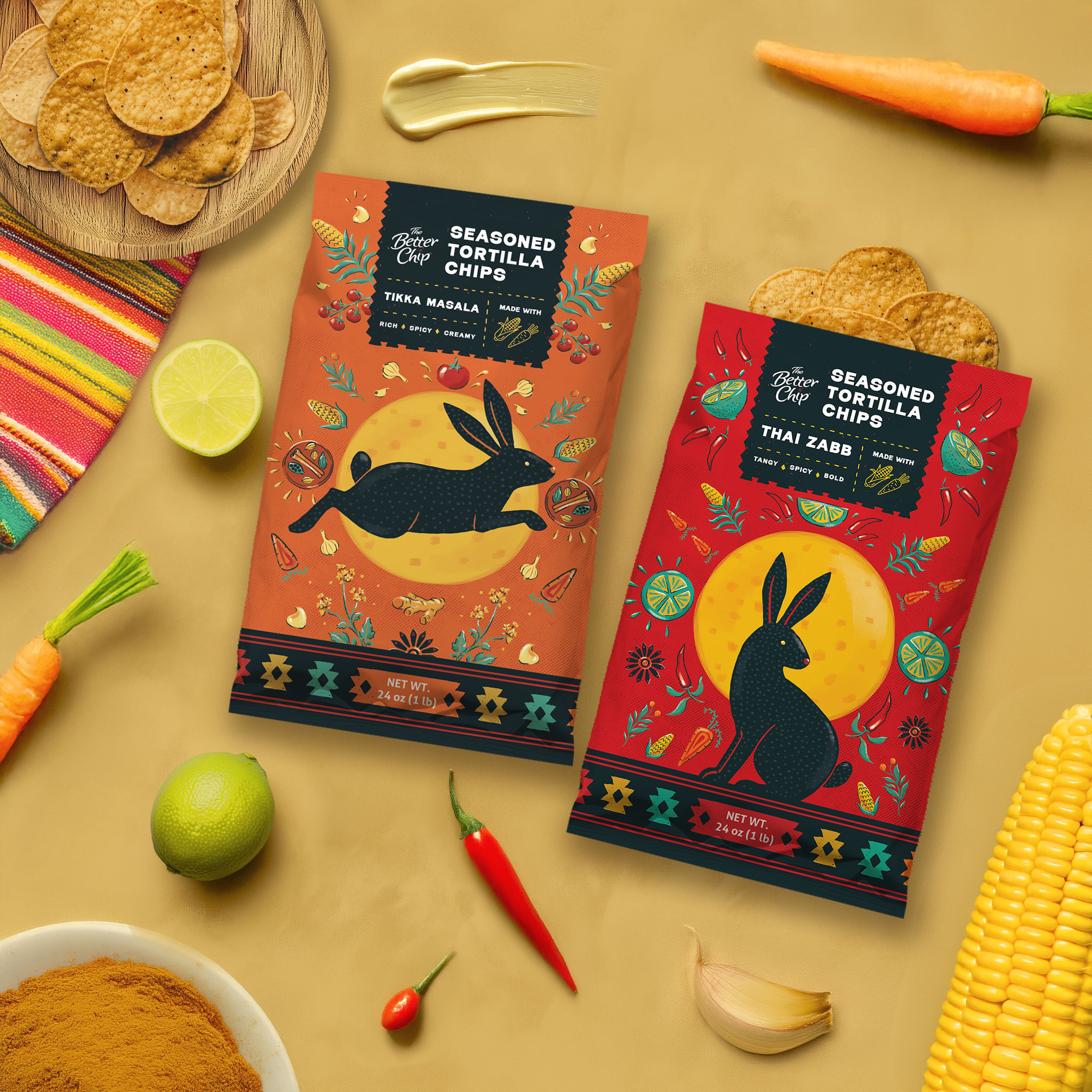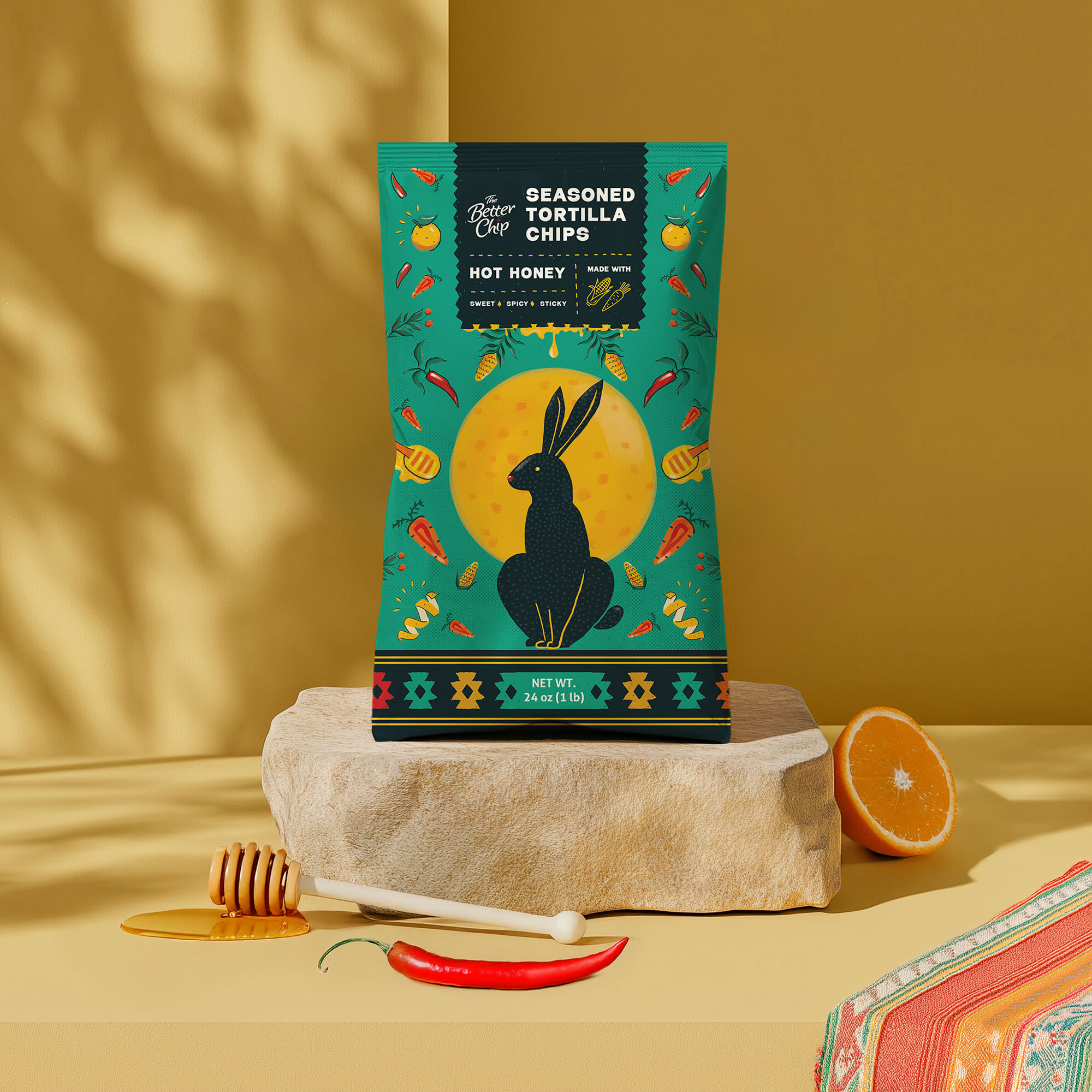 The Better Chip packaging design pays homage to the ancient tale of the Rabbit on the Moon, reimagining the round tortilla chip as the moon itself. According to legend, a kind rabbit offered its food to a starving traveler, who was actually a deity in disguise. Moved by the rabbit’s generosity, the deity honored it by placing its image on the moon. This visual storytelling is woven into the design concept, blending myth with vibrant, traditional Mexican patterns—a nod to the deep-rooted connection between tortillas and Mexican heritage. The mirrored, geometric patterns, inspired by Mexican folk art, feature the rabbit, the moon, and key ingredients like carrots, chilies, and honey, varying by flavor. The result is a bold, eye-catching composition that balances authenticity with modern and playful appeal. Designed for a club-size, family-style bag, the packaging features a high-contrast color palette, with striking combinations like bright yellow and red or orange and green, ensuring strong shelf impact. A minimalist font provides clarity, allowing the intricate, colorful elements to shine. Crafted to captivate Gen Z and Millennials, this design blends bold creativity with cultural storytelling, ensuring The Better Chip stands out in the competitive snack aisle.