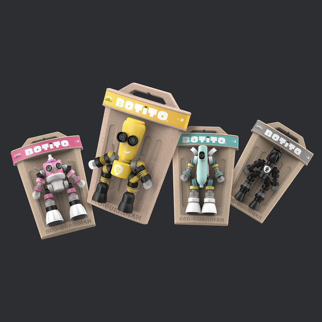 Designed for circular systems, BOTITO’s packaging encourages kids to rethink waste and supports environmental education. A sustainable toy that turns plastic waste into educational eco-guardians. Its packaging, inspired by a waste bin, uses 100% recycled paper pulp, making it fully recyclable and compostable.