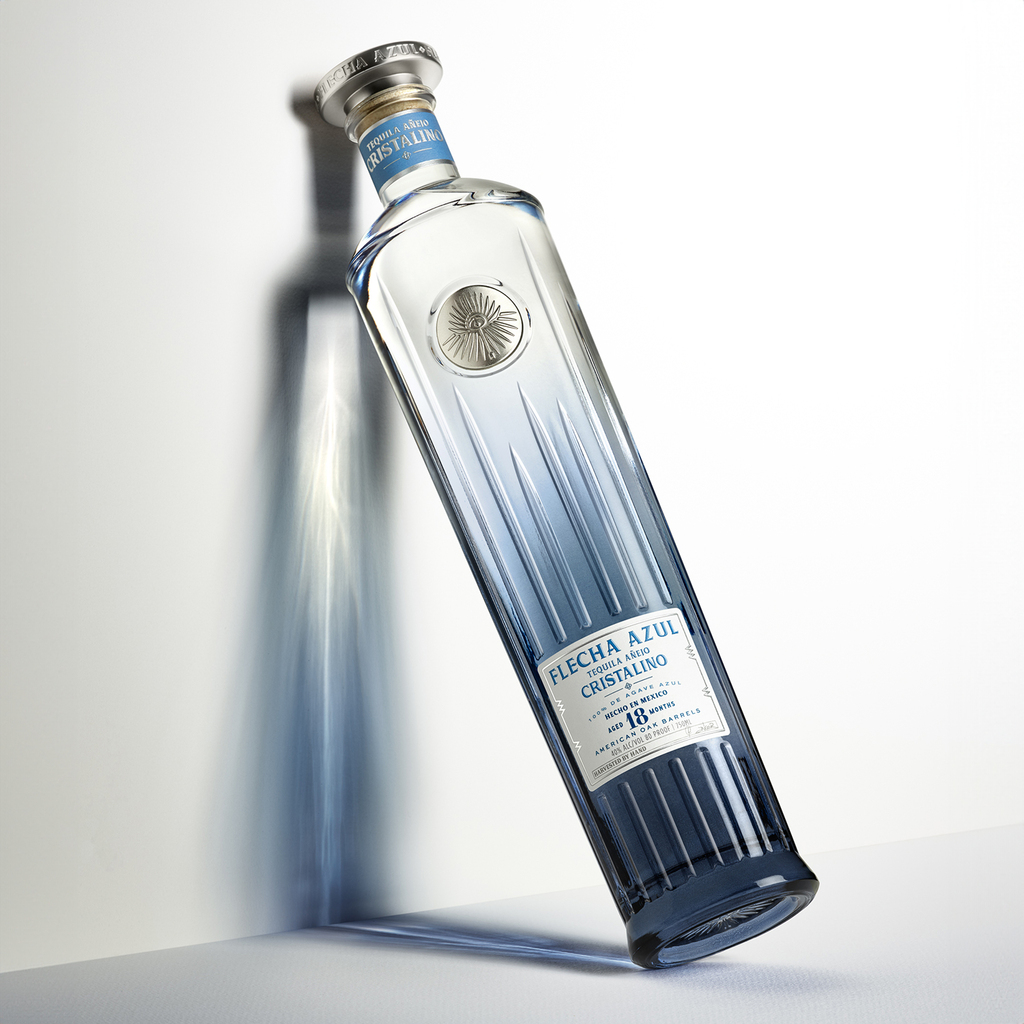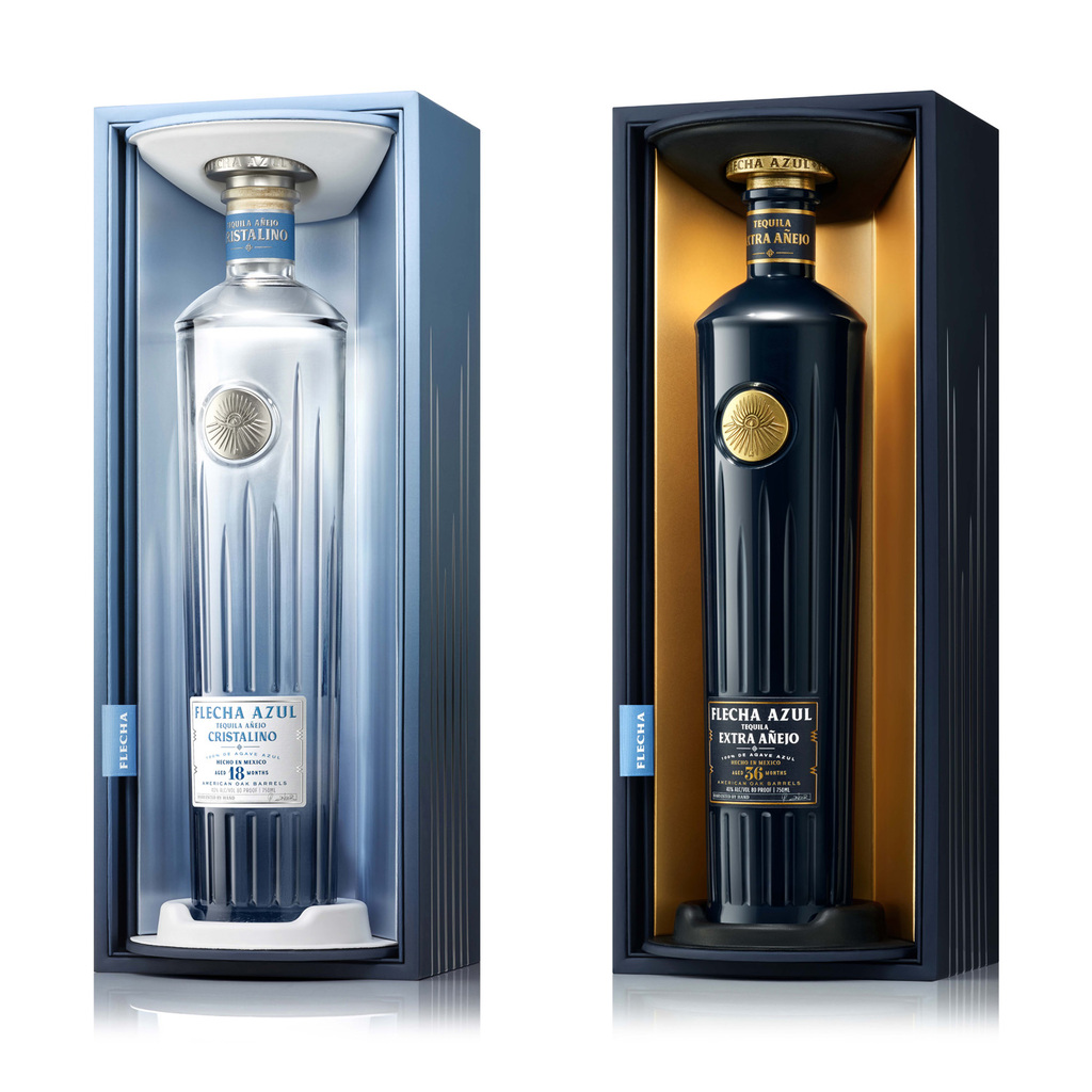 Whereas Flecha Azul Tequila Extra Añejo is aged 36 months in American Oak Barrels. With designers created a more ceramic-looking bottle to reflect the weight of the longer aging process.