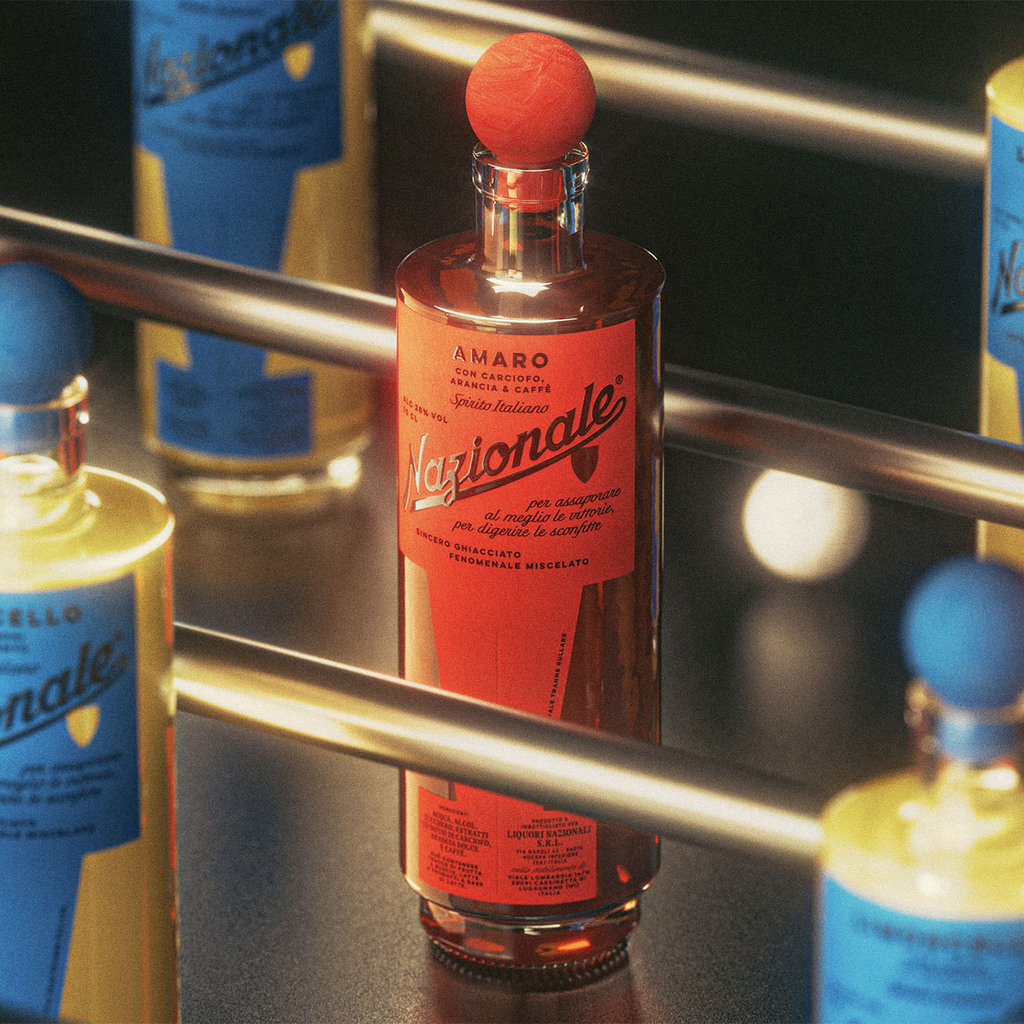 The concept revolves around traditional Italian bars: a uniquely Italian way of being together, fully expressed around the tables of foosball, timeless icons of these spaces. The bottles are crafted as stylized representations of foosball players, featuring their distinctive colours: red vs. blue, amaro vs. limoncello. The spherical custom cap serves as the head, while the shaped label on the front of the bottle becomes the player’s body. The circular back label represents the ball, and the paper used evokes its typical surface.