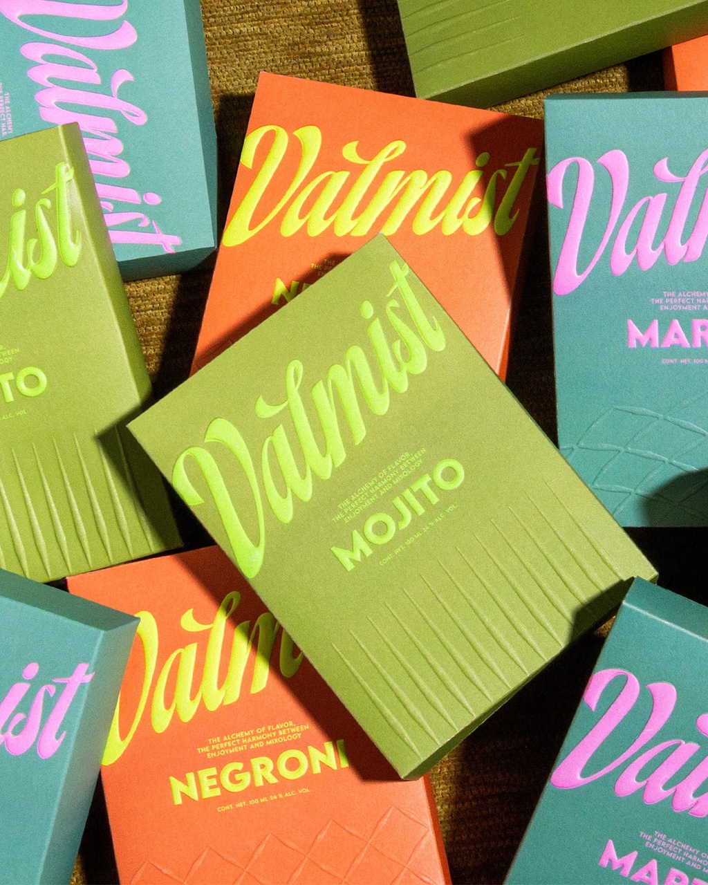 The studio created a bold and refined identity that reflects the brand glamorous personality. Each packaging represents a different cocktail, designed with a colour that evokes the actual tone of each drink, along with a texture that recalls the glassware in which it is served.