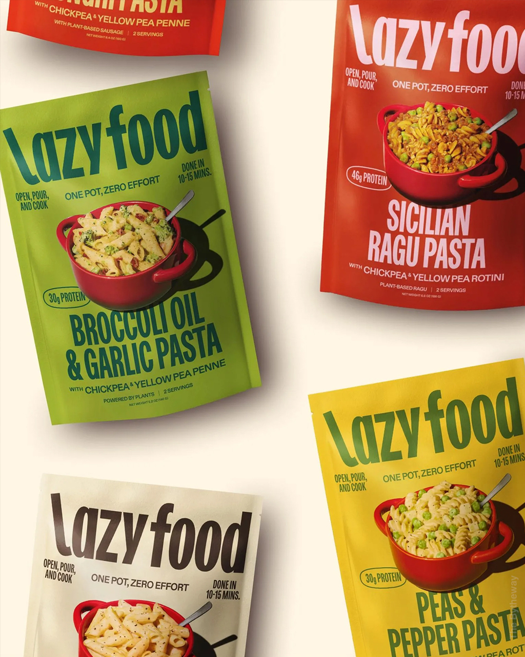 The packaging features a bold, no-fuss design that mirrors the brand’s zero-effort cooking promise. Bright, solid backgrounds paired with playful typography and an overhead shot of the meal served directly in a red pot communicate simplicity, flavour, and convenience at a glance.