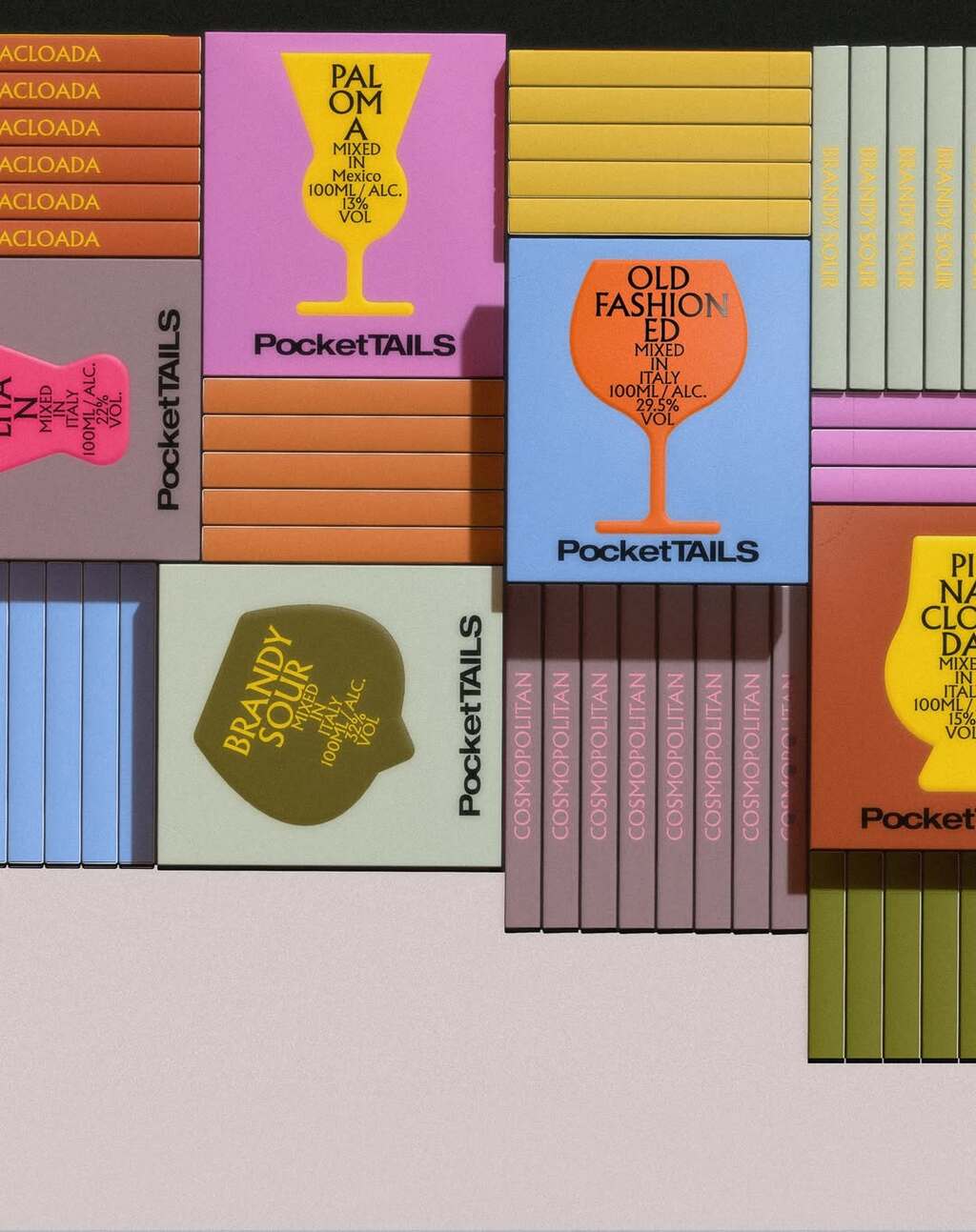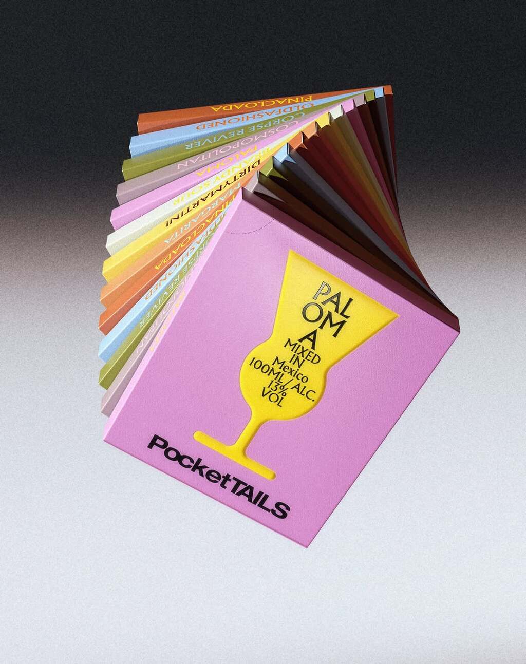 The packaging features bold, minimal graphics where classic glassware silhouettes represent each cocktail. A vibrant colour palette differentiates the varieties, while the compact format emphasises portability and convenience.