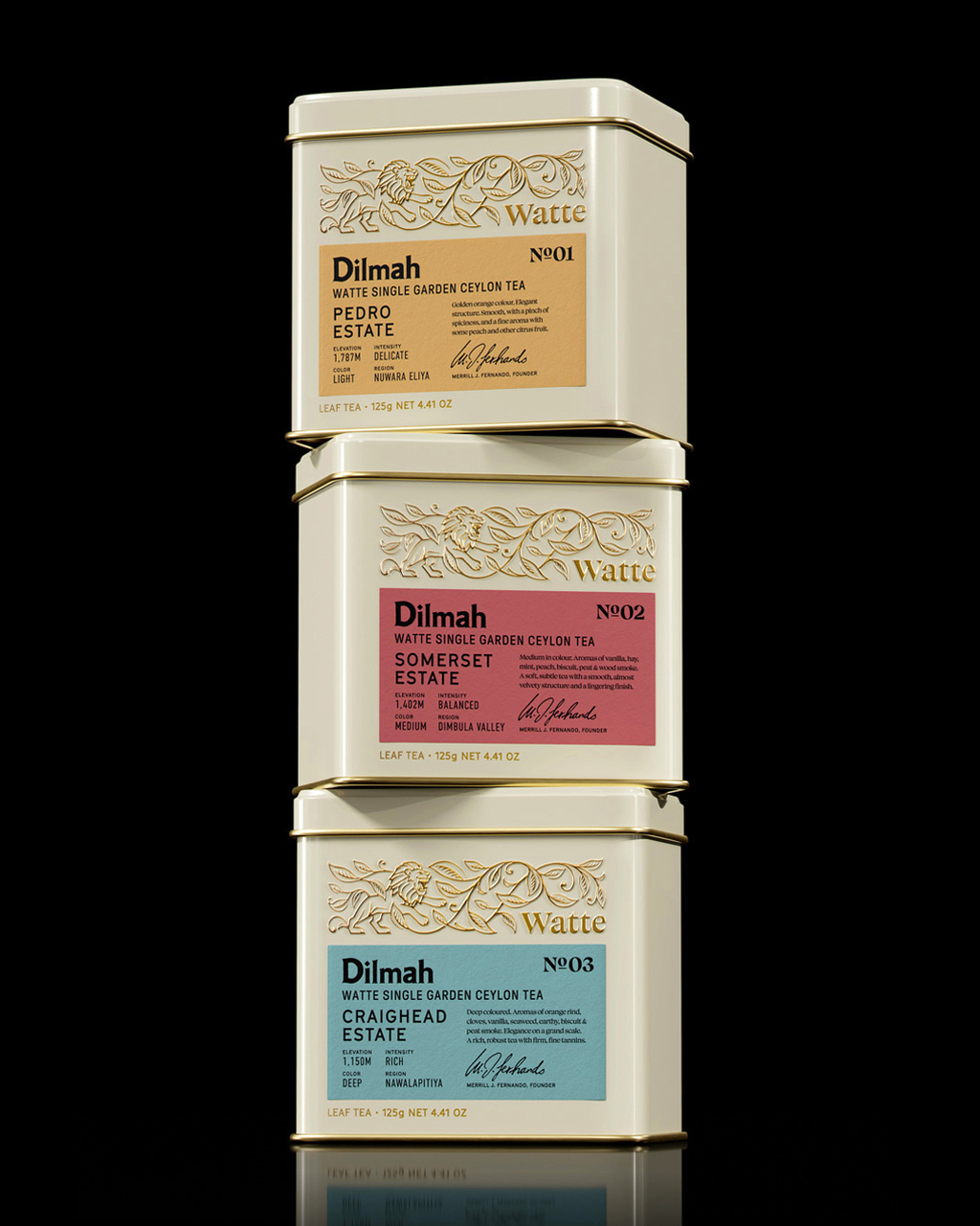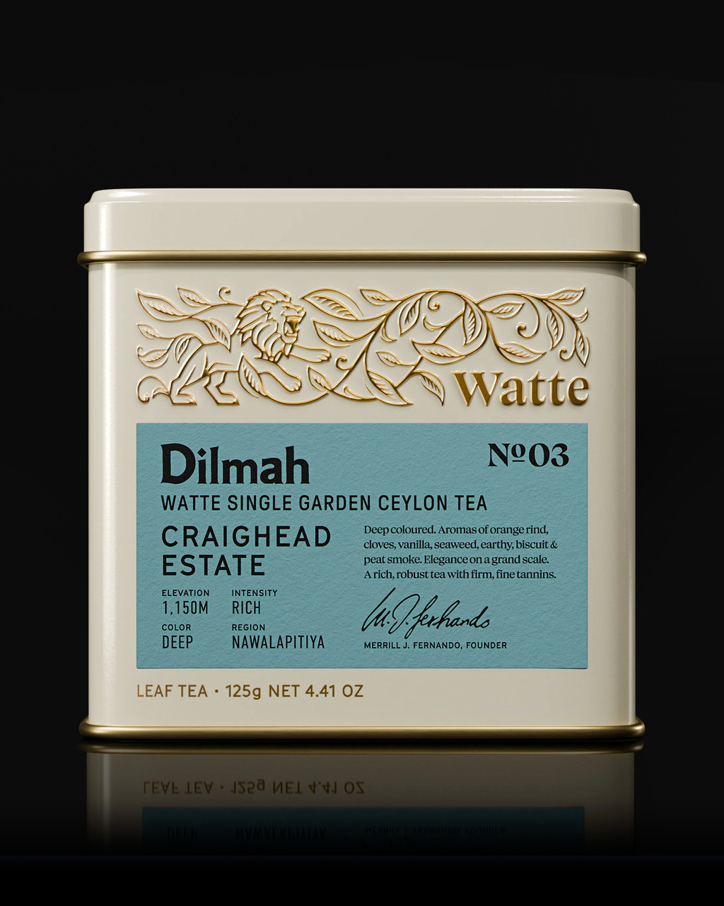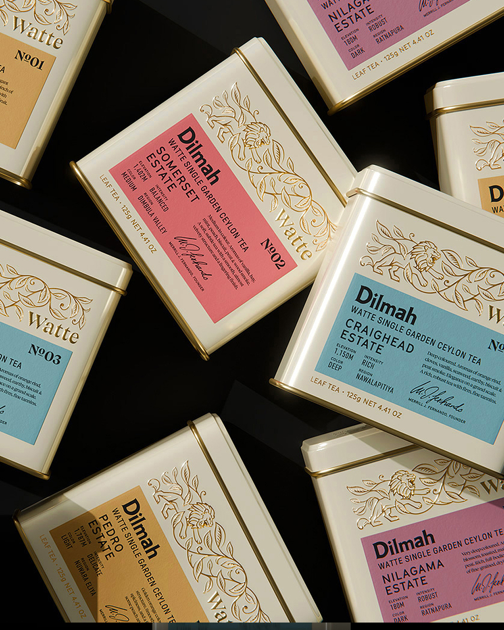 The packaging features sleek tins with a refined, modern design. Each variety is distinguished by a bold, coloured label, complemented by elegant gold embossing of the Dilmah Watte lion motif. Clean typography and subtle detailing highlight the tea’s origin and characteristics, reflecting the premium quality and craftsmanship of each selection.