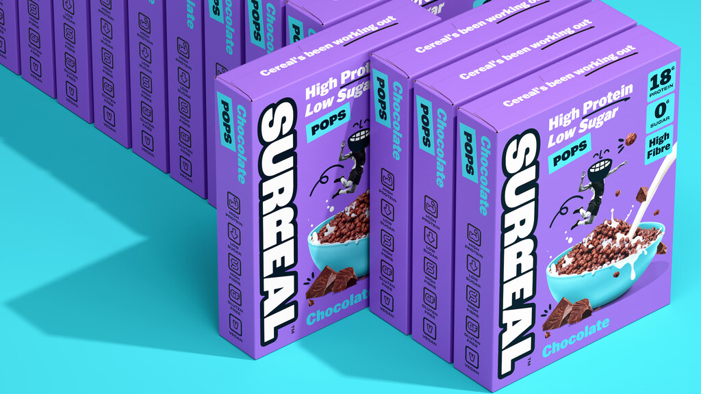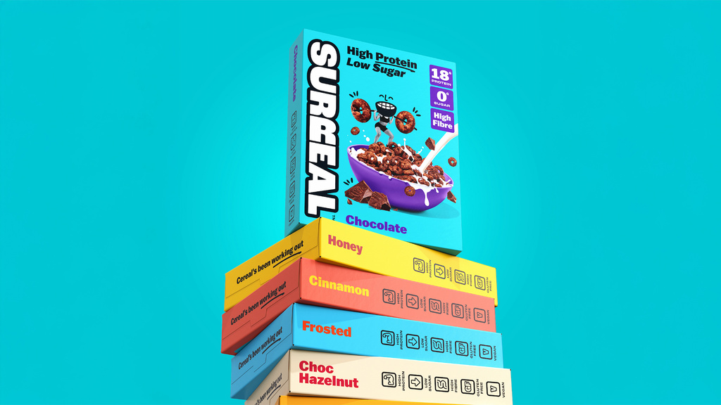 Working in close collaboration with the Surreal team, the creative platform “Surreal’s Been Working Out” became the foundation for the refresh — dialling up the brands colour palette and typography, strengthening product storytelling, and introducing bold on-pack claims paired with tasty, energetic product photography, shot with Frankie Turner. Every box features a bespoke back of pack design and story, aiming to re-invent cereal with a Surreal twist, they cover topics such as pop art, science fiction and retro computer games.