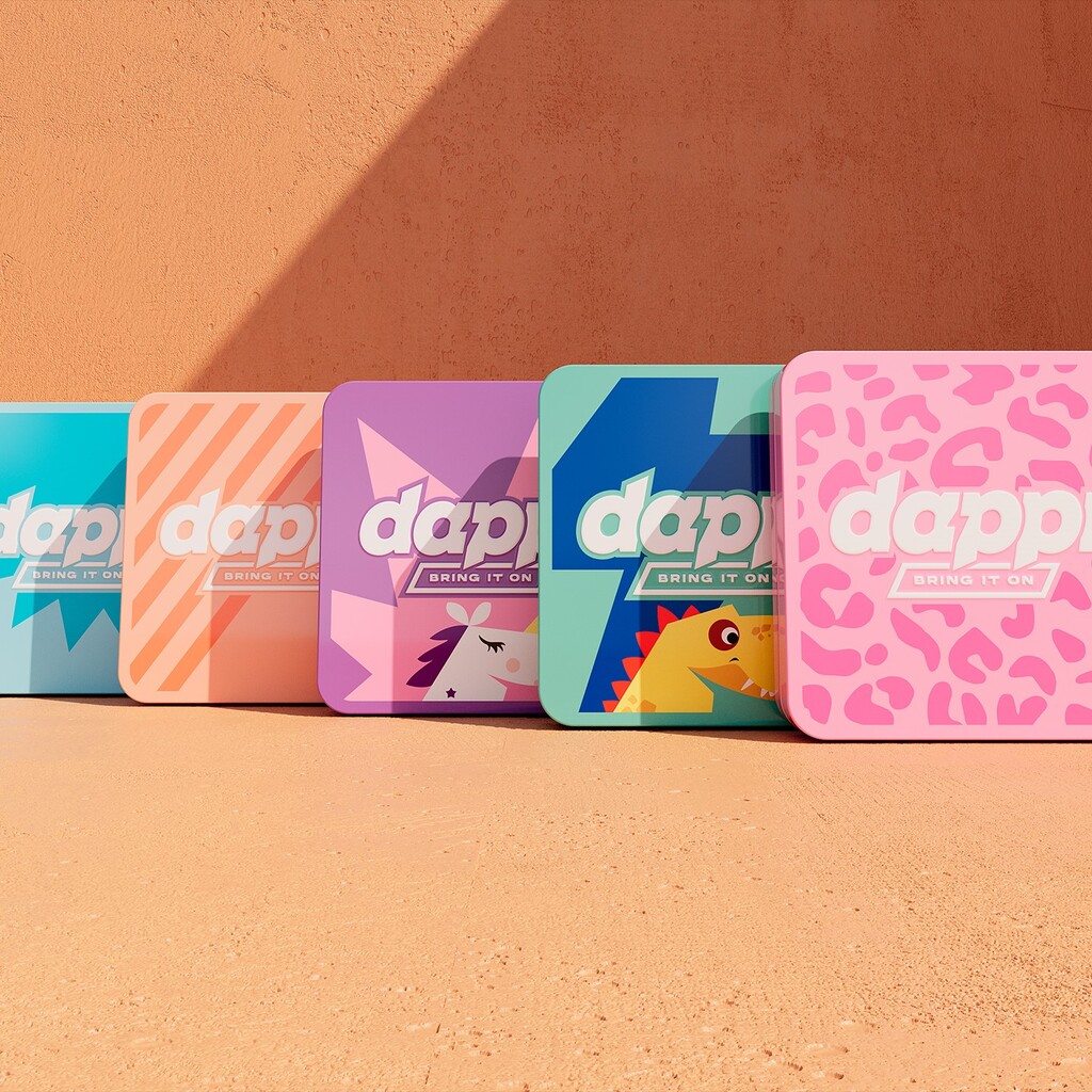 Dappr is an urban healthcare brand designed for those who dare. Its bold identity features vibrant colours, energetic graphics, and a dynamic slanted logo with a spark at its heart. The first product range—eco-friendly bandages in a tin box—breaks away from dull designs with five playful themes and a unique slanted shape, reflecting the brand’s active and fearless attitude.