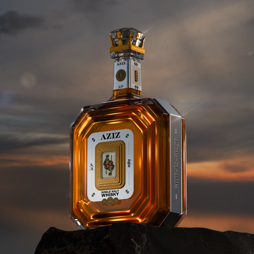 Aziz reimagines traditional whiskey aesthetics with a design rooted in romance and regal elegance. Inspired by the Urdu word for "beloved," its emerald-shaped bottle features metallic braces and a central playing card depicting a king with a sword and a queen with a rose—symbols of their unbreakable bond. A gold-plated frame with four screws narrates their love story, while the crown-shaped cap, adorned with a diamond, signifies majesty. The bottle’s neck bears the numeral "38" on a metal plaque, adding intrigue. Encased in a grand wooden box that opens like castle doors guarded by sentinels of love, Aziz reveals a luxurious whiskey inside.