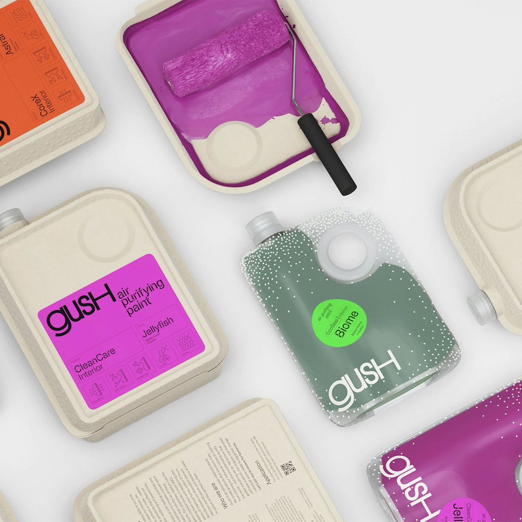 Each Gush container opens into two trays, with the paint housed in a transparent bag between them. Made of low-impact, biodegradable acetate, the bag has a flat bottom so it can stand upright and a clear cap to see the color. The container is made of molded paper pulp, which has never been used before for paint trays in the US. The circular handle echoes the shape of the Gush symbol, and a bubble pattern of particles is embossed into the molded pulp.