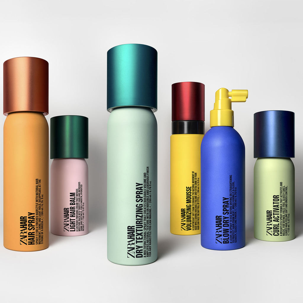 Each item in Zara’s first evergreen styling drop is designed in its own unique colorway with matching carton, giving each product its own look and identity. Subsequent launches are also designed in unique colorways for each product and contrasting finishes on the bottles and caps. In punchy vibrant colors with a matte texture, most of the collection is aluminum, reducing the number of plastic components. Caps, in various vibrant colors, have a sophisticated satin metallic finish.