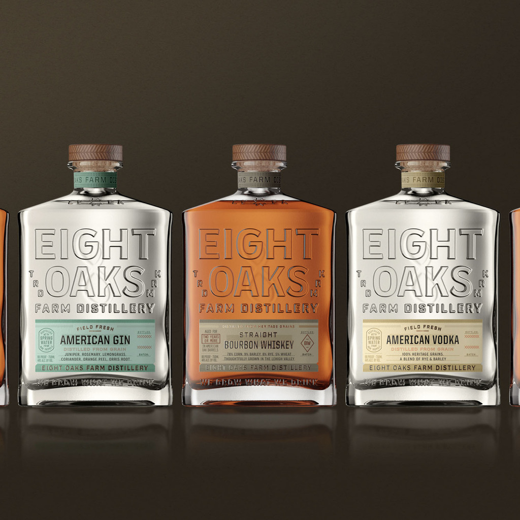 Eight Oaks Farm Distillery is so much more than spirits. It's a farm just as much as it is a distillery, and they plant, grow, harvest, malt, mill, mash, distill, age, and bottle everything onsite in Pennsylvania's Lehigh Valley. With this rebrand, Makers & Allies' goal was to show the world what the phrase "grain to glass" truly means by encapsulating the full spectrum of what Eight Oaks is capable of.