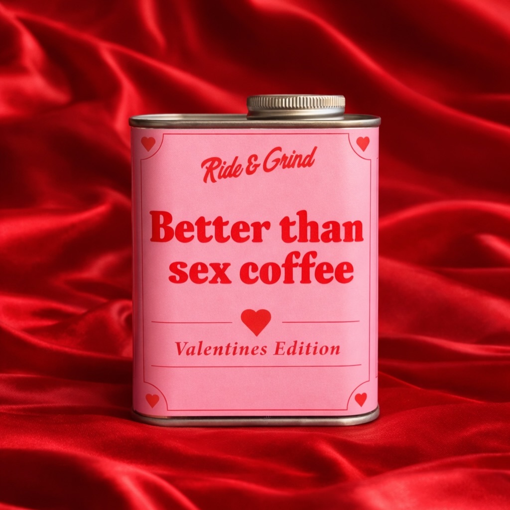 A playful twist on romance, this Valentine’s Edition coffee pairs bold typography with blush pink hues and heart motifs, turning caffeine into a cheeky declaration of desire.