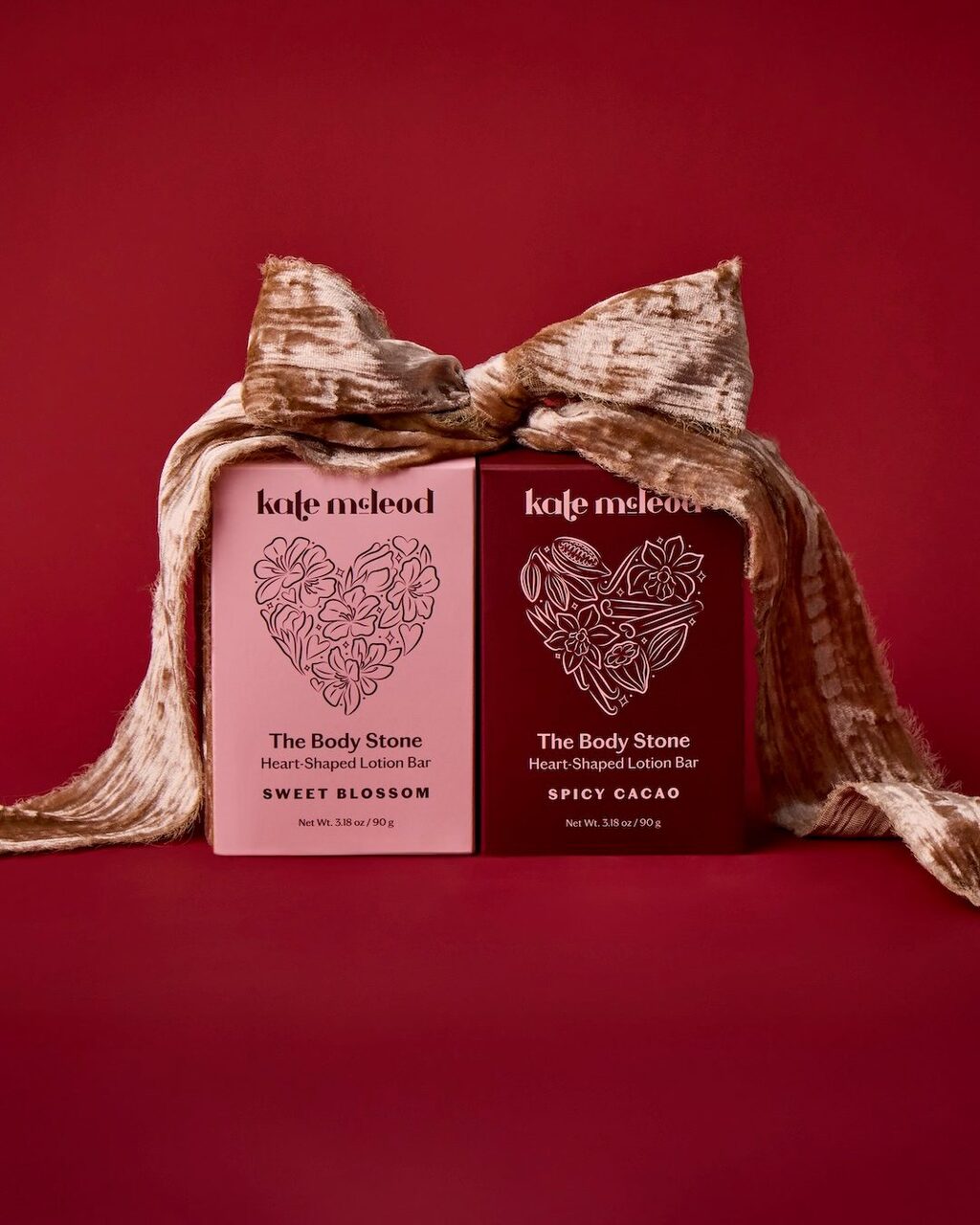 Rendered in romantic shades of blush and deep red, these heart-shaped lotion bar boxes lean into Valentine’s Day with delicate floral illustrations and elegant linework. The contrasting colour palette and refined typography strike a balance between softness and sensuality, making self-care feel like a love letter.