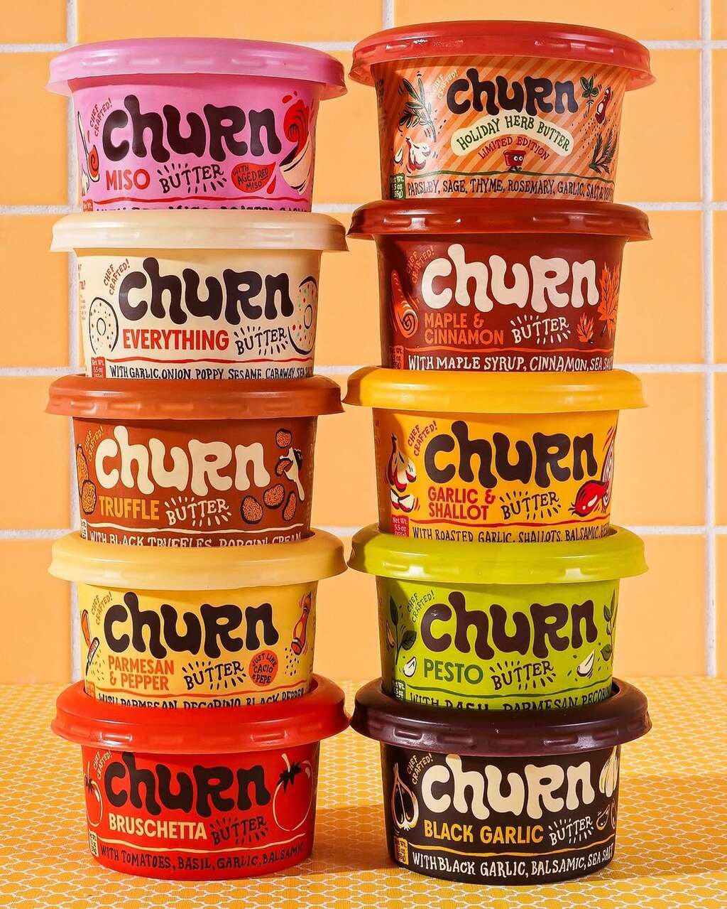 This vibrant packaging features bold, playful typography with a hand-drawn feel. Each butter flavour is distinguished by a rich colour palette and ingredient-inspired illustrations. The brand name "Churn" stands out in dynamic lettering, while flavour details add a crafted yet modern touch, making the design fun and approachable.
