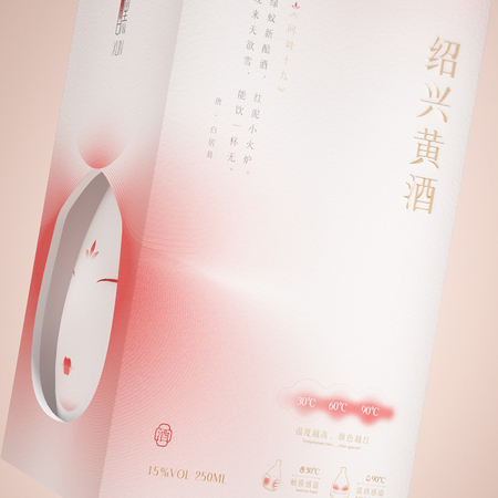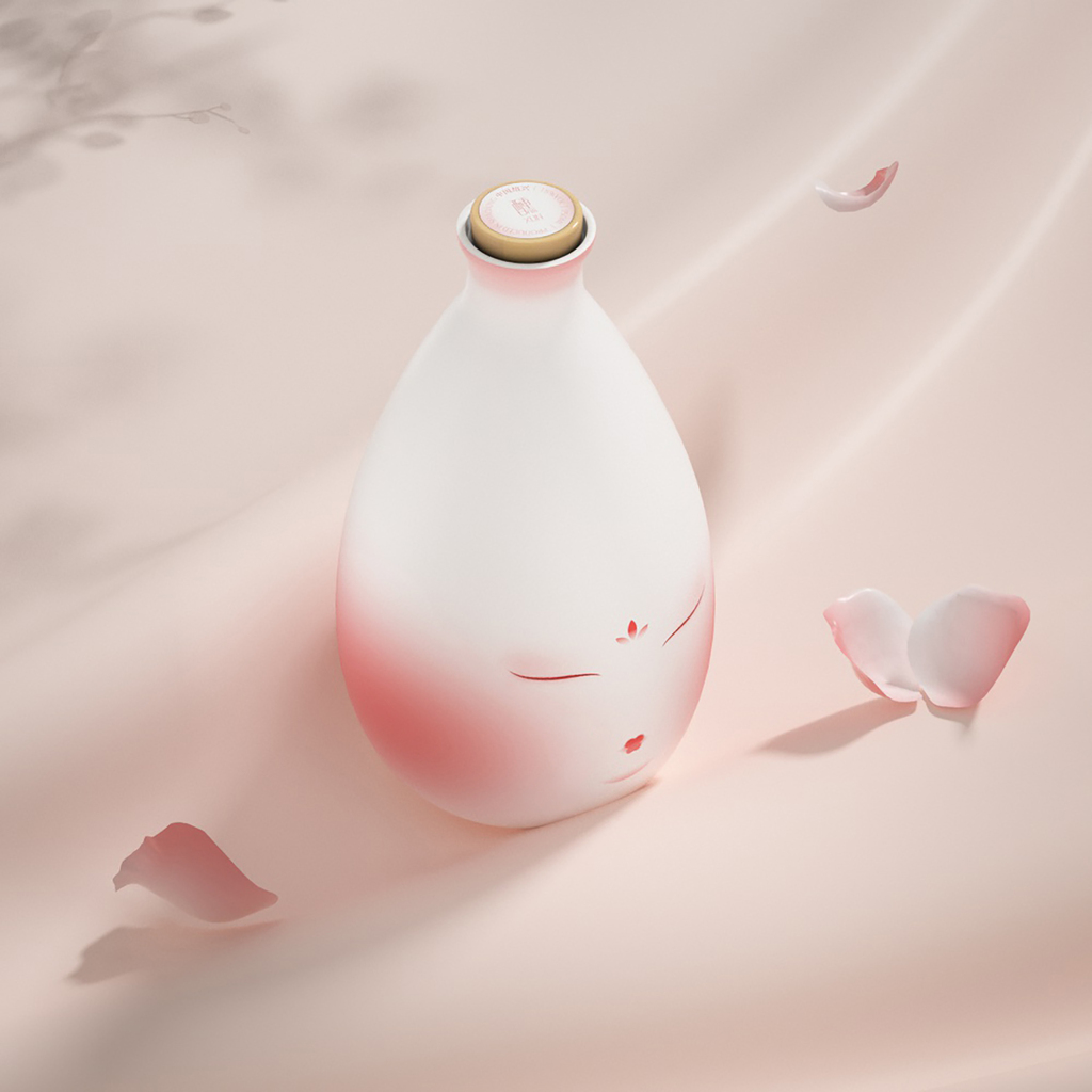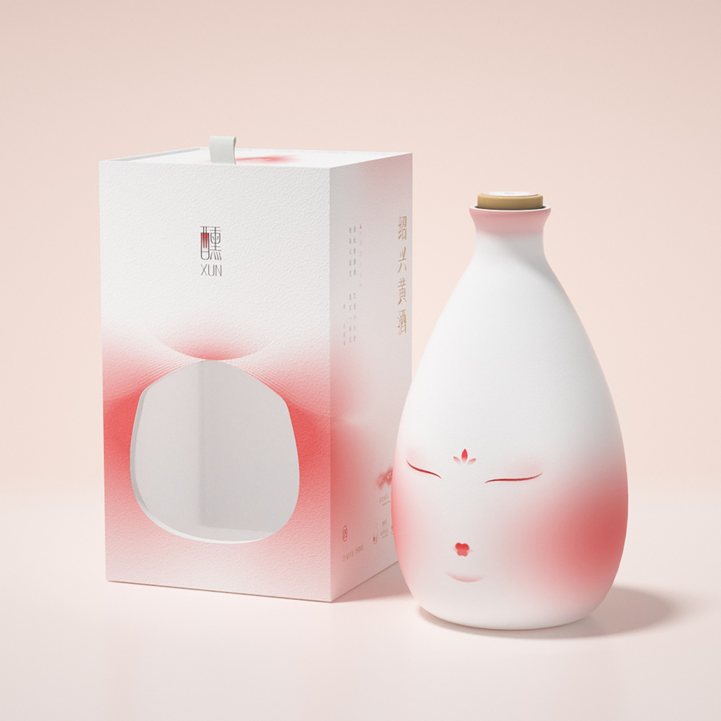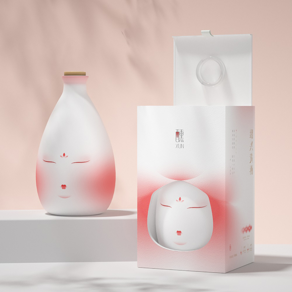 The brand "XUN," meaning slight intoxication, is inspired by the blush after a glass of wine. The bottle features a playful Tang Dynasty lady whose cheeks blush when touched or heated, thanks to thermochromic paint, adding a fun, interactive ritual. The skeletonized packaging highlights the design and invites consumers to engage with the product.