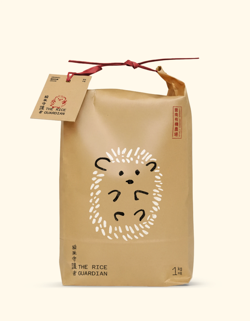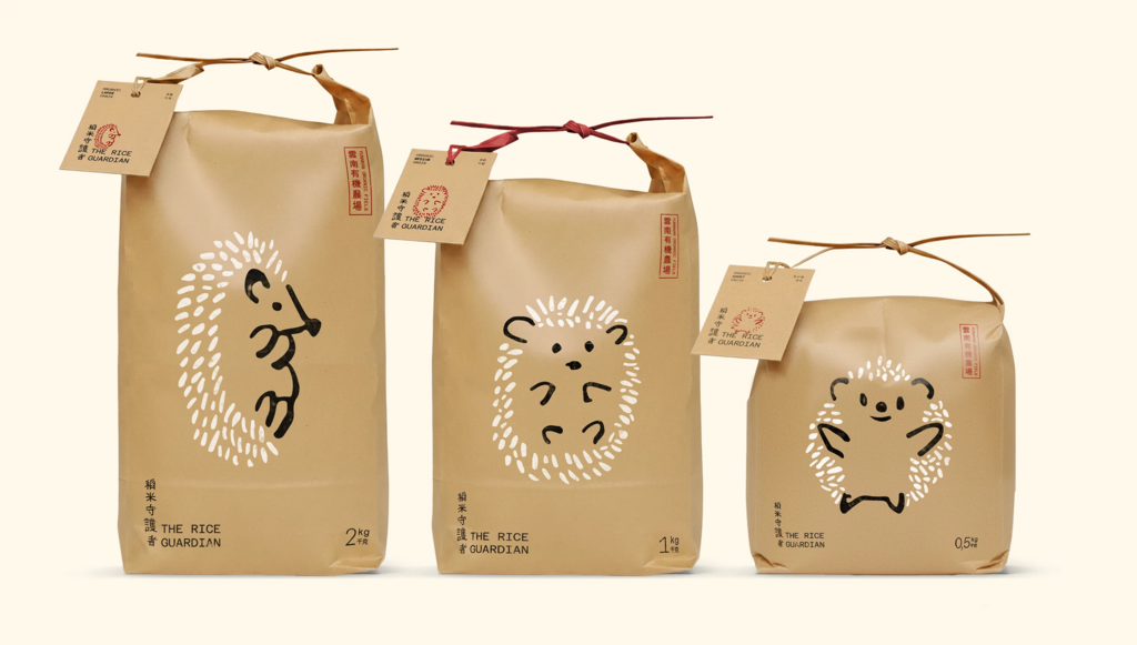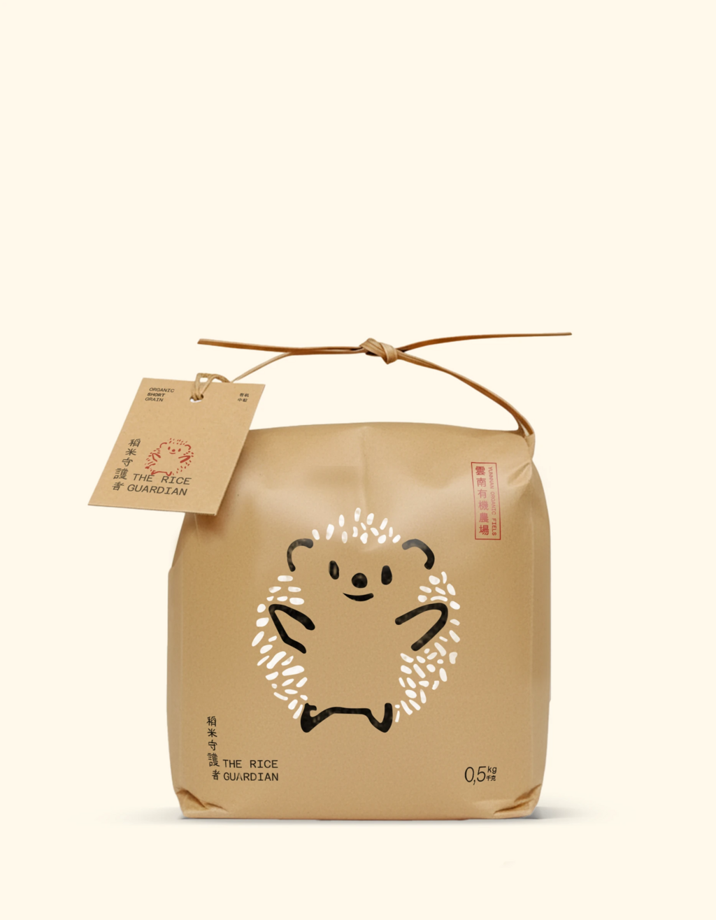 The packaging features a playful hedgehog illustration, symbolising the natural guardianship of the rice fields. The design is complemented by subtle rice grain motifs and handwritten-style typography, giving the pack an artisanal, handcrafted feel.