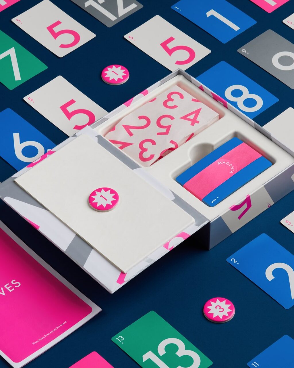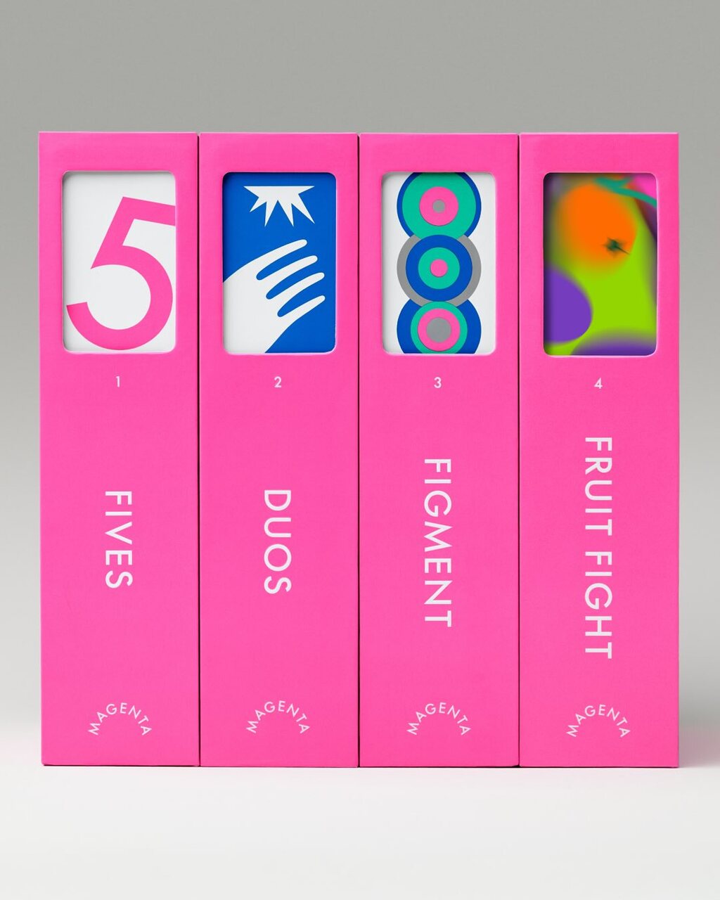 The packaging has two layers: a bold exterior for striking shelf presence, and an interior that highlights each game’s personality. A solid magenta unifies the collection, while playful die-cuts reveal illustrations matching the card backs, adding surprise and delight.