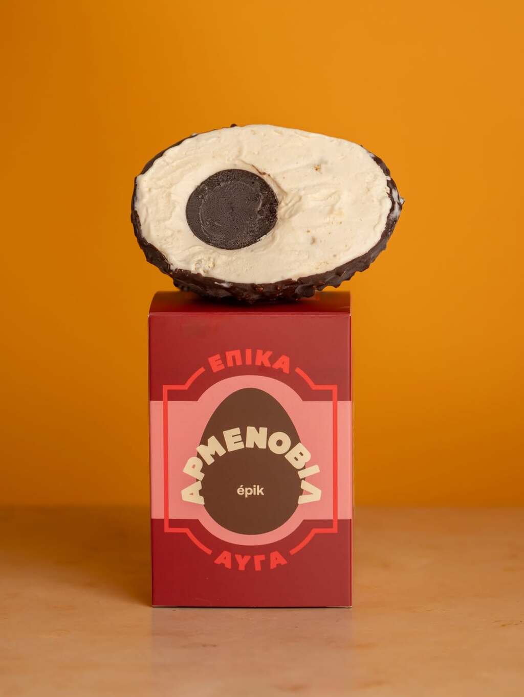 A bold, contemporary Easter egg packaging featuring a rich colour palette and a central egg-shaped graphic that frames the product name. The design combines clean geometry with playful typography, creating a strong shelf presence whilst maintaining a premium feel.