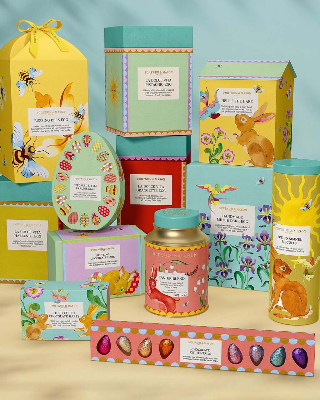 Working with Fortnum & Mason, Here designed Ostara: a range of over 20 products rooted in that story, with the hare as protagonist throughout. From a 500g milk chocolate Spring Hare to praline eggs laid in real shells, miniature matchbox hares to a full children’s line featuring Harrie, a bird-turned-hare with her own tale to tell.