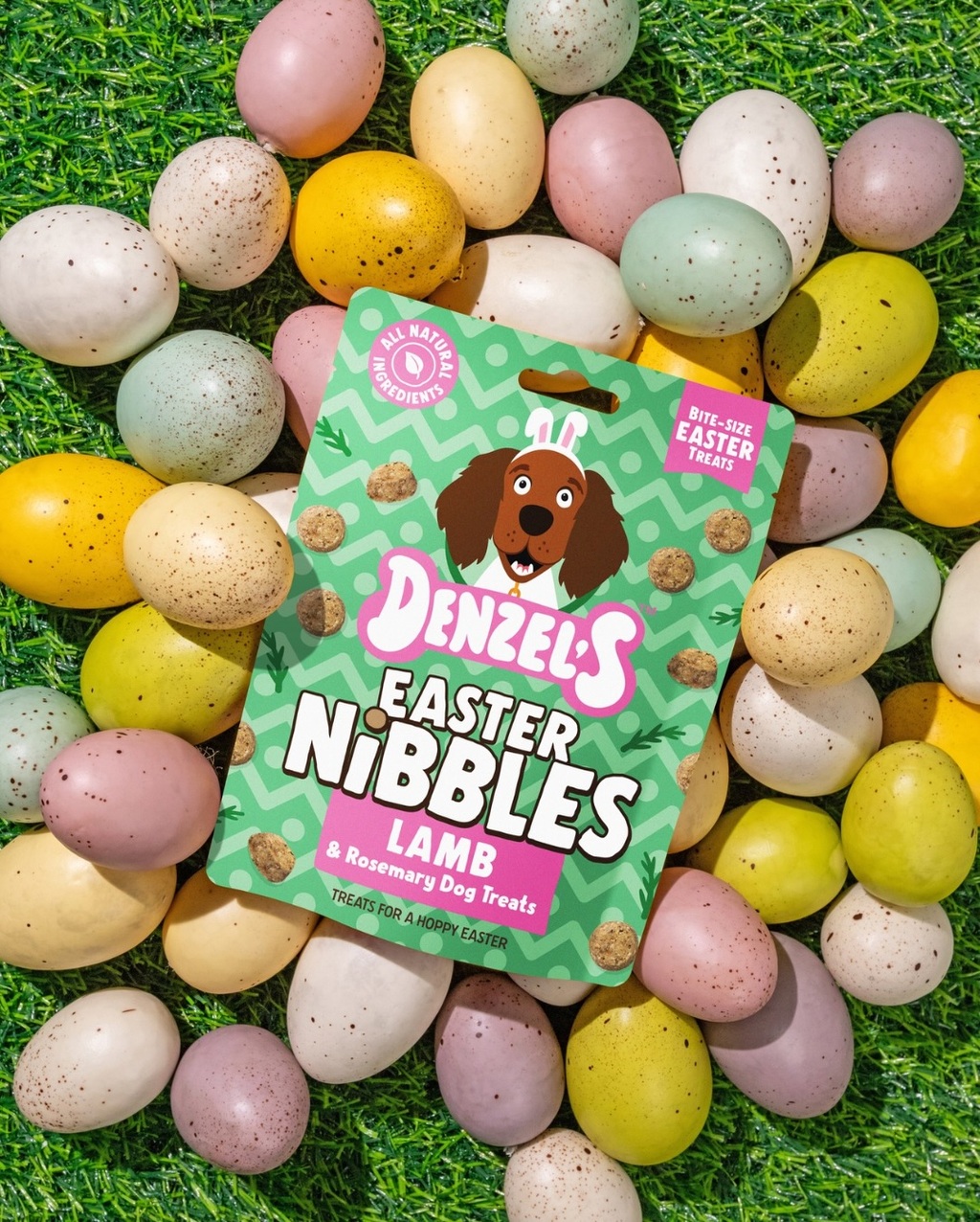 A vibrant dog treat packaging featuring a playful illustrated dog wearing bunny ears. The design uses pastel colours, bold typography, and festive patterns, highlighting its natural ingredients and bite-sized treats.