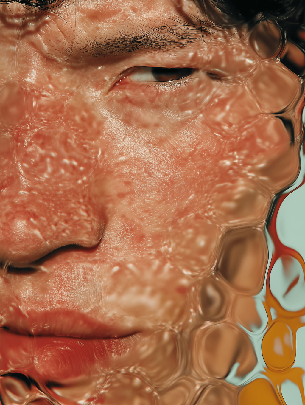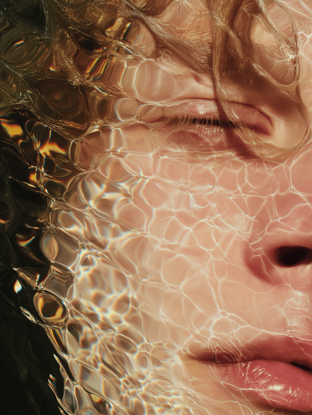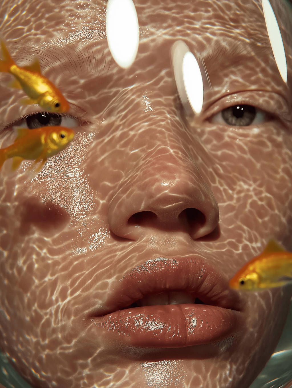 This commitment to beauty—problematic, layered, and insistently human—defines their latest exploration: a body of **AI-generated hyperrealist photography** that pushes the boundaries of material perception. These works, many of them featuring submerged faces refracted by water and light, shimmer with the hallucinatory tactility of glass and skin. They look less like outputs of a machine and more like impossible photographs captured in some experimental atelier. And yet, they are born entirely from a dialogue between human intention and artificial imagination.