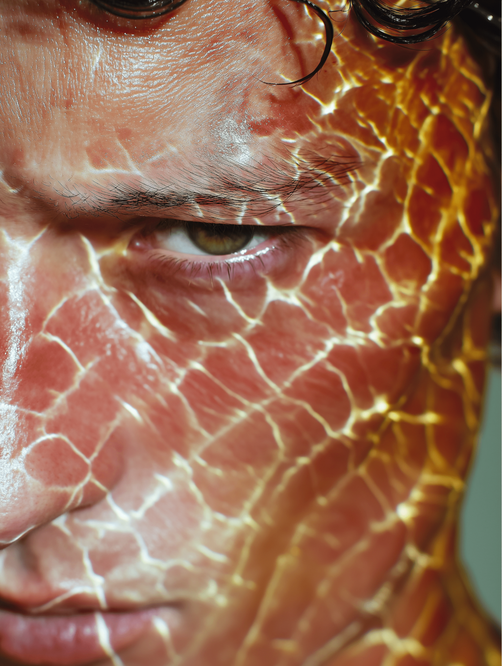 The duo’s current hyperrealist series extends this philosophy into the terrain of photography. At first glance, these images resemble high-resolution fashion editorials: wet skin, rippling water, sunlight fractured into prismatic patterns. Look closer, however, and the impossible perfection of these details betrays their origin in an AI system. Here lies the paradox: hyperrealism is used not to simulate reality but to “amplify its impossibility”.