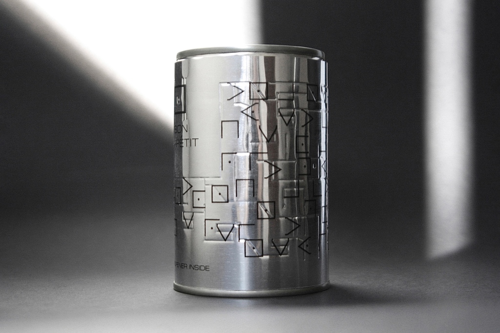 Visually, the design features a custom typeface inspired by the Napoleon cipher, forming a typographic maze around the can. This maze, which reveals the message “Any person marches on his stomach”, emphasises the role of logic and humanity in solving crises. The packaging becomes a tool of empathy and reflection, prompting viewers to consider not just the existence of solutions, but our responsibility to use them.