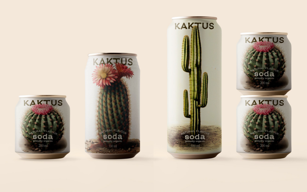 Kaktus is an organic soda that celebrates body diversity through playful, thoughtful packaging. Each can features a different cactus, highlighting the natural variety in shape, size, and form — just like human bodies. The design reminds us that every body is unique and beautiful in its own way. The blooming cacti symbolize resilience and inner beauty. Like these desert plants, we thrive in tough conditions, and when we embrace who we are, we flourish.
