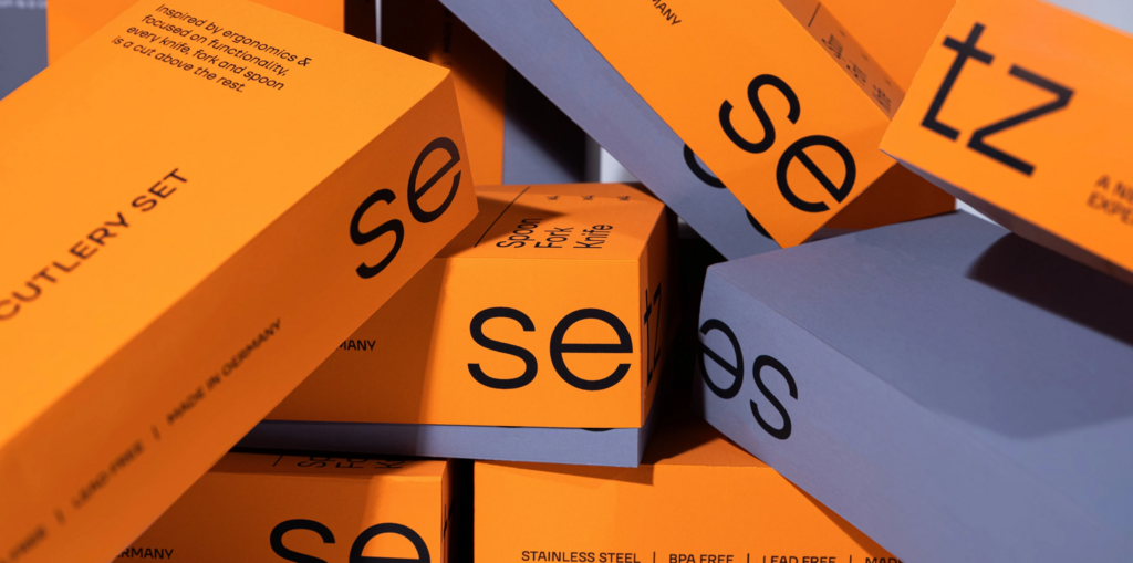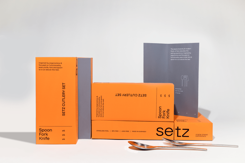 Setz is a premium cutlery brand with a focus on form and functionality. Inspired by the Bauhaus structure and bold clarity, the packaging houses a pop orange to stand out on the shelf with the product information on the front of the pack to highlight the simple and direct functionality of the product itself.