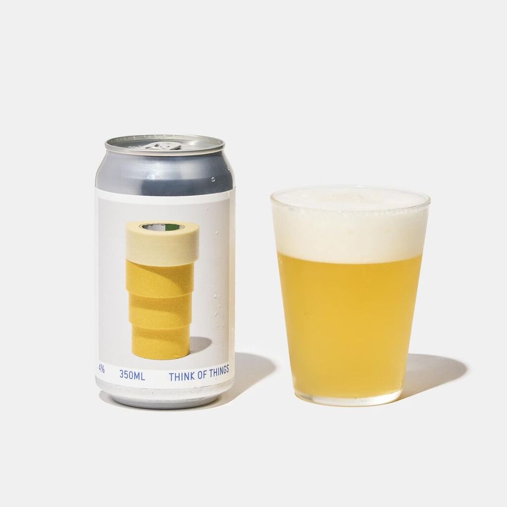 The beer can design features labels with yellow and white tape, cleverly mimicking the appearance of a glass of beer and capturing the essence of the product in a playful and visually appealing way.