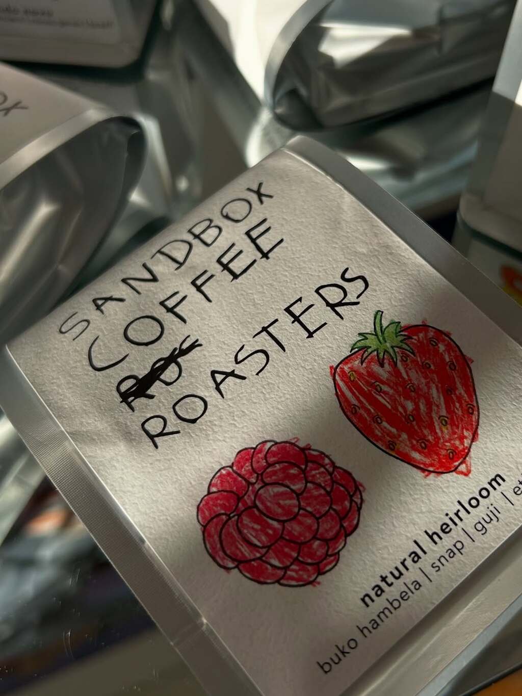 The packaging features a clean, minimalist look with hand-drawn fruit illustrations that add a playful and artisanal touch. The simple typography and white background highlight the drawings, giving the overall design a fresh, handcrafted feel.