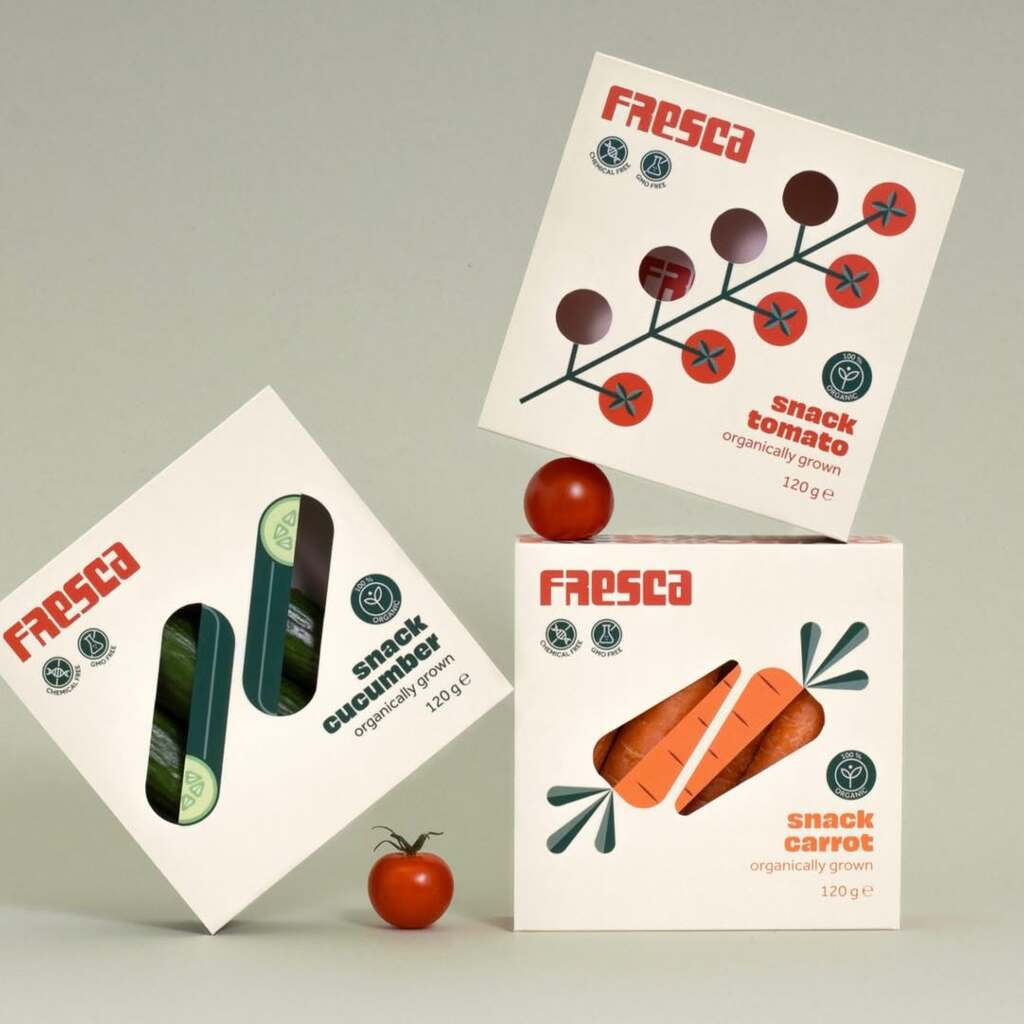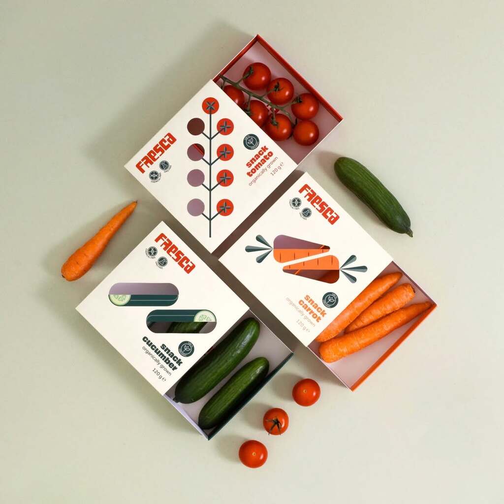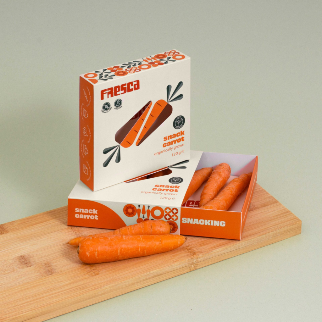 The packaging embodies sustainability and simplicity, featuring a functional, eco-conscious structure made from recyclable paper. Clean illustrations and clever window cut-outs highlight each fresh snack whilst the minimal layout and earthy palette reflect the brand’s organic ethos.