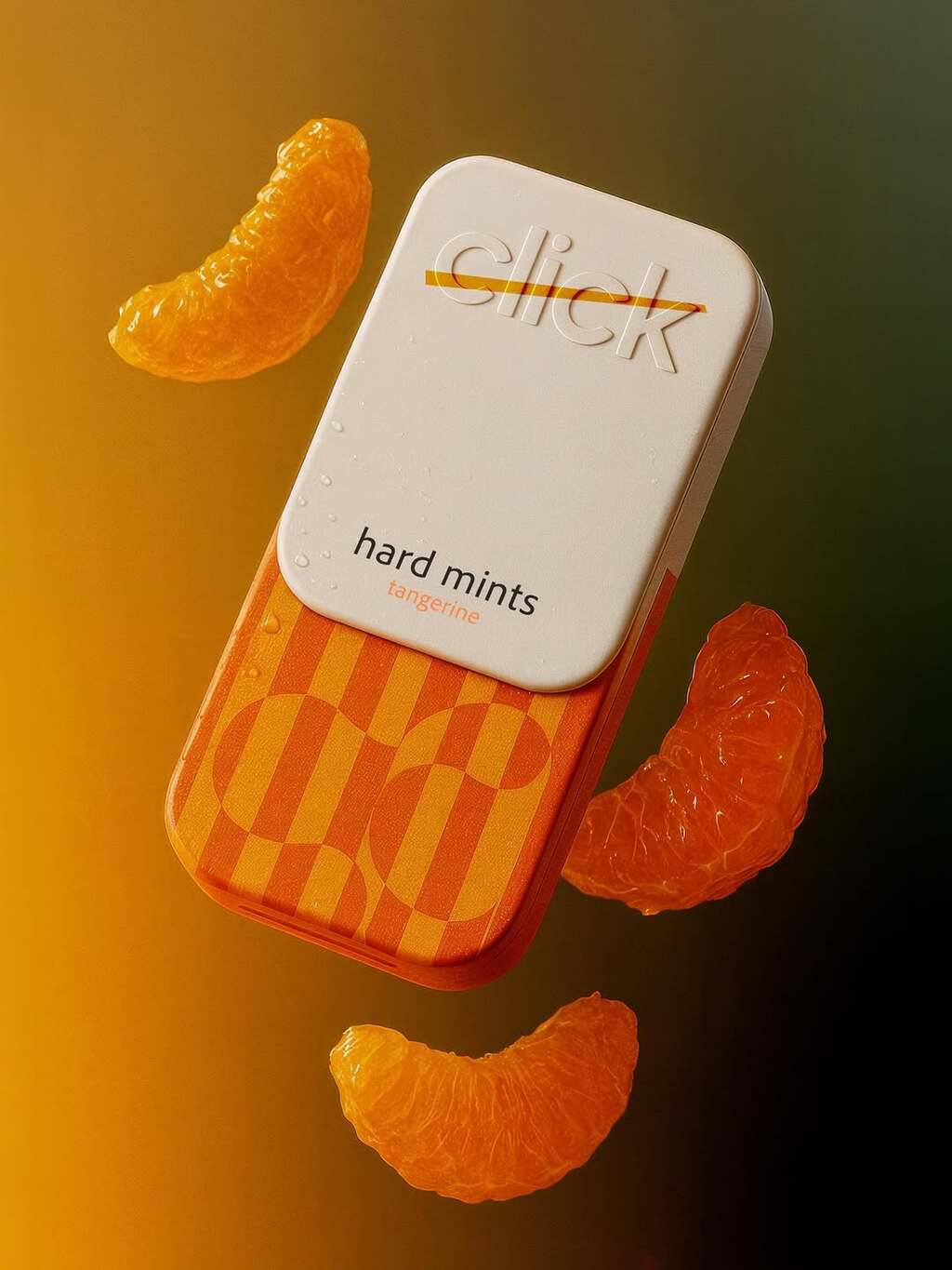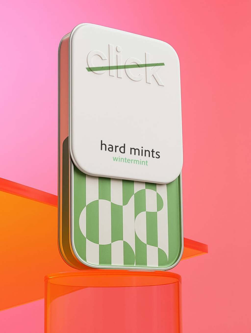 The packaging features a sleek, modern design with bright colours that capture each mint flavour. Clean white lids embossed with the brand name pair with bold geometric patterns, creating a fresh, vibrant, and cohesive visual identity.